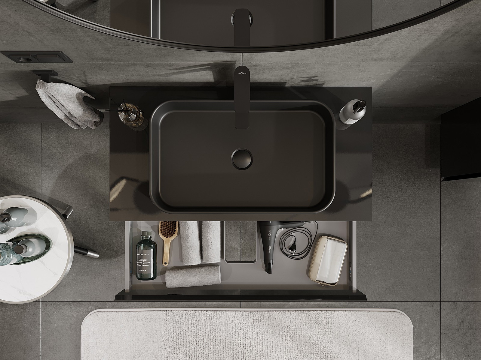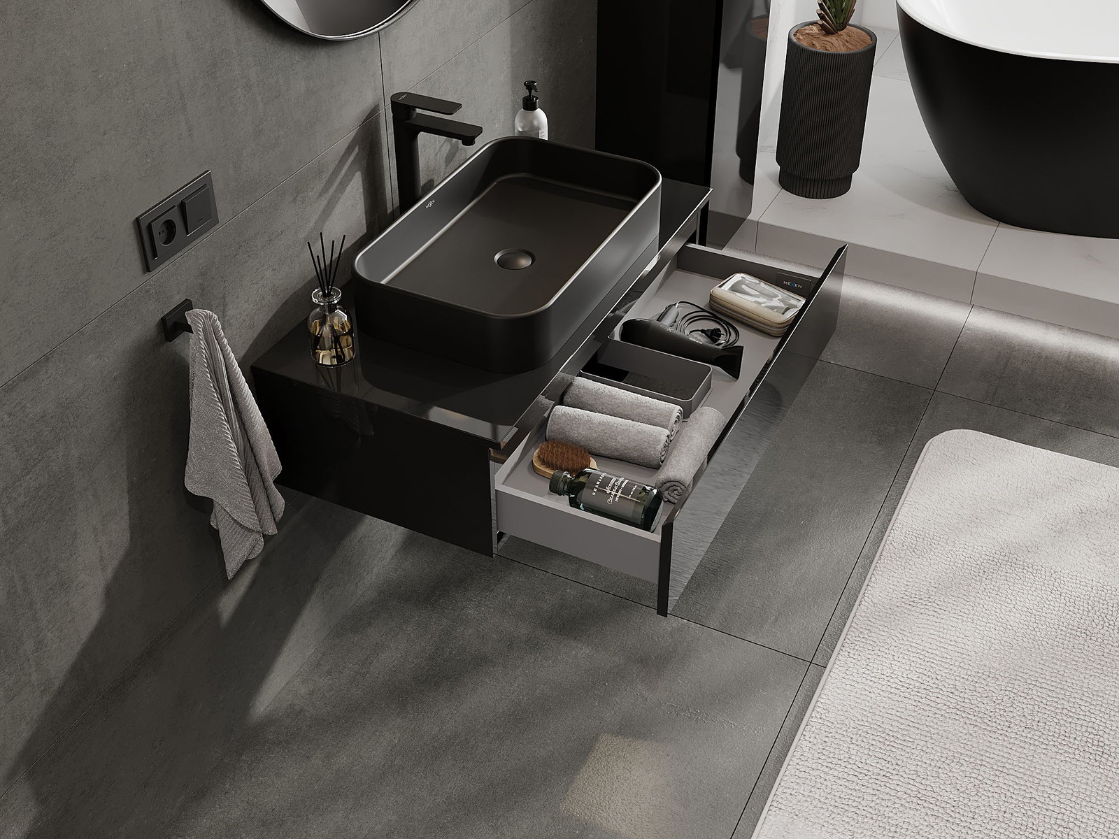 Изрезът в чекмеджето е проектиран по такъв начин, че да побере сифона, който е необходим в мивковите инсталации. Благодарение на това мебелът може да бъде монтиран напълно функционално, без да се налага отказване от пространството в чекмеджето заради инсталацията.