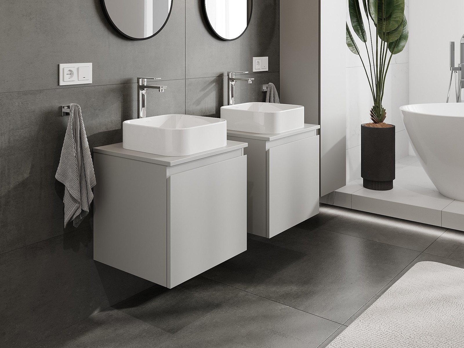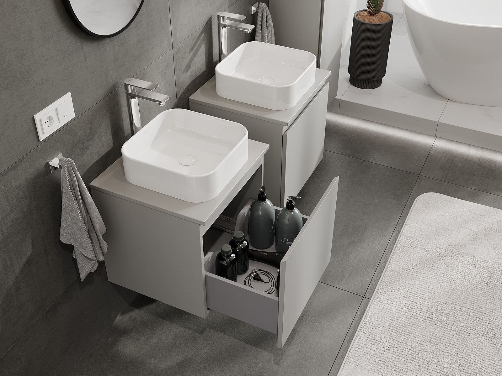 Нашите модулни мебели за баня могат да се комбинират в различни цветови конфигурации, което позволява пълна персонализация. Може да се избере както външният вид, така и функциите на отделните елементи, което позволява съчетаване на мебелите със собствените стилови и функционални предпочитания.