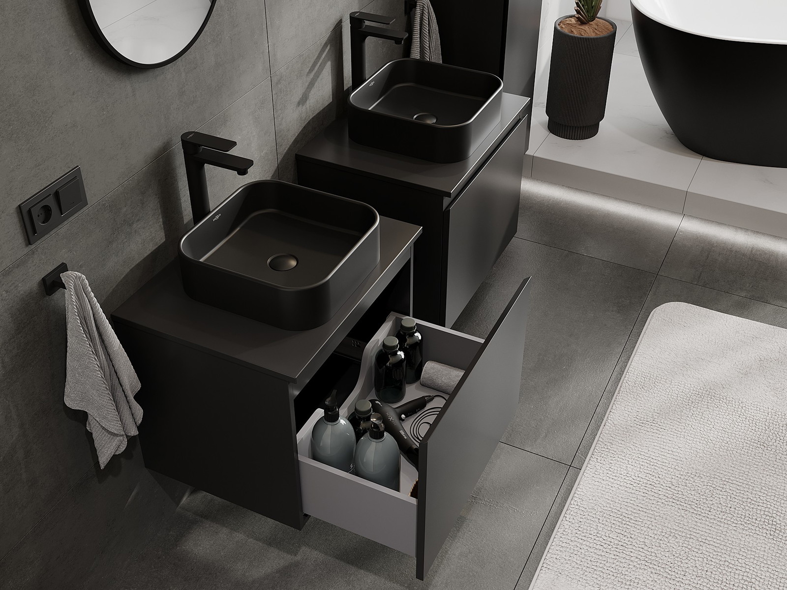 Нашите модулни мебели за баня могат да се комбинират в различни цветови конфигурации, което позволява пълна персонализация. Може да се избере както външният вид, така и функциите на отделните елементи, което позволява съчетаване на мебелите със собствените стилови и функционални предпочитания.