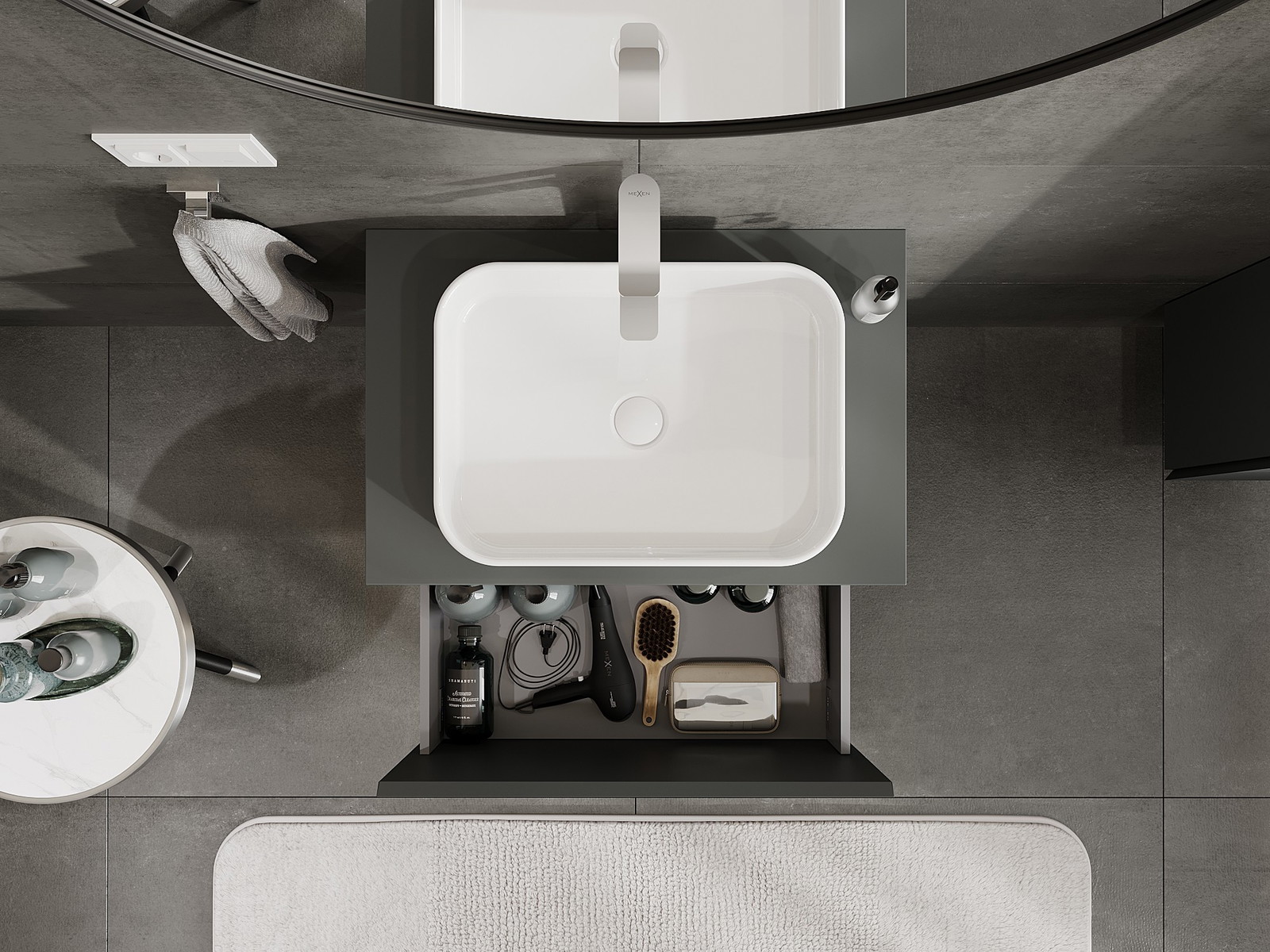Изрезът в чекмеджето е проектиран по такъв начин, че да побере сифона, който е необходим в мивковите инсталации. Благодарение на това мебелът може да бъде монтиран напълно функционално, без да се налага отказване от пространството в чекмеджето заради инсталацията.