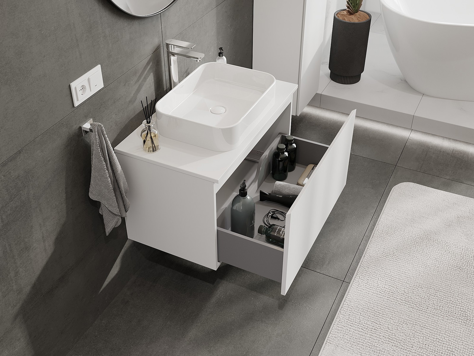 Нашите модулни мебели за баня могат да се комбинират в различни цветови конфигурации, което позволява пълна персонализация. Може да се избере както външният вид, така и функциите на отделните елементи, което позволява съчетаване на мебелите със собствените стилови и функционални предпочитания.