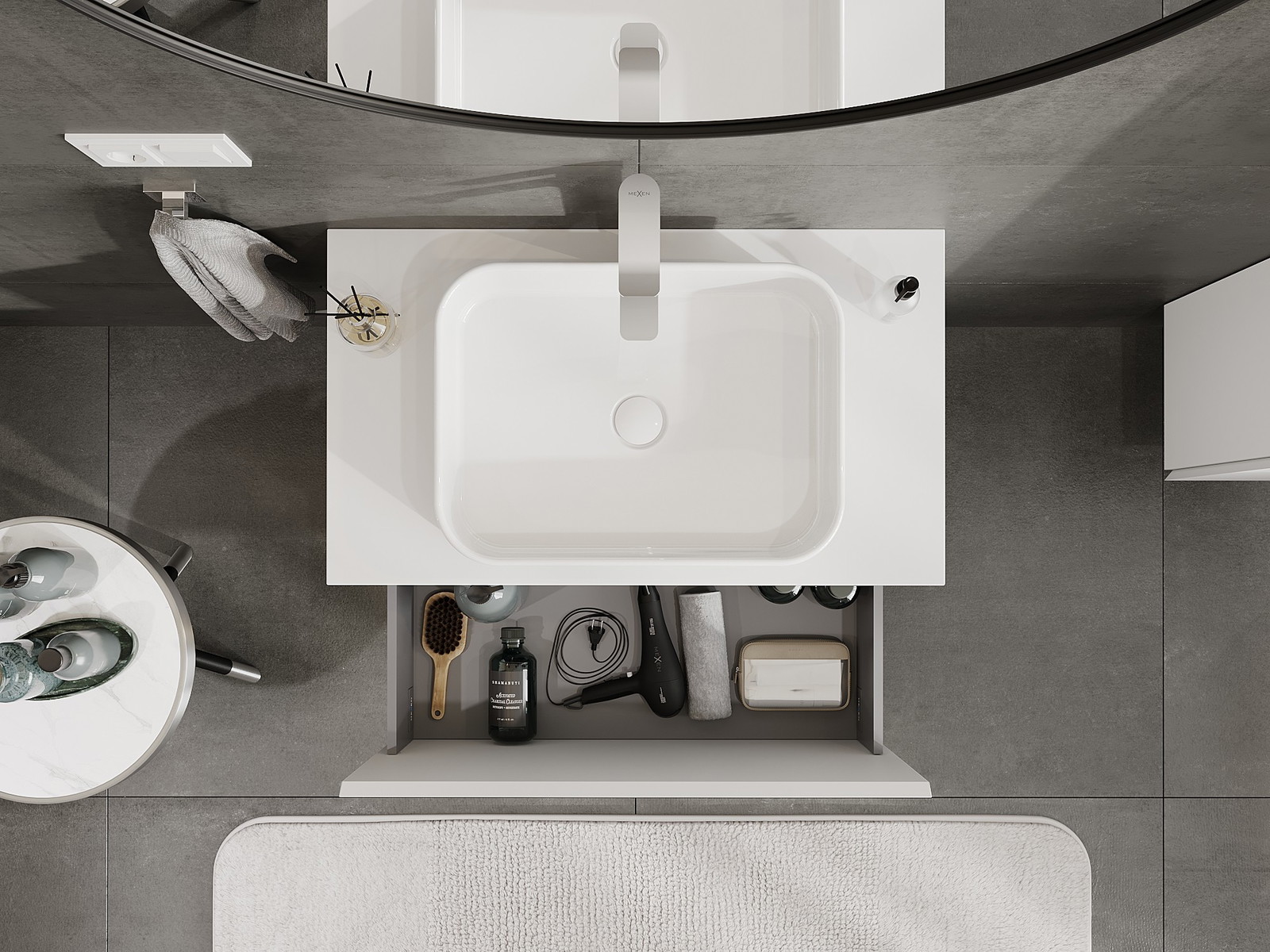 Изрезът в чекмеджето е проектиран по такъв начин, че да побере сифона, който е необходим в мивковите инсталации. Благодарение на това мебелът може да бъде монтиран напълно функционално, без да се налага отказване от пространството в чекмеджето заради инсталацията.