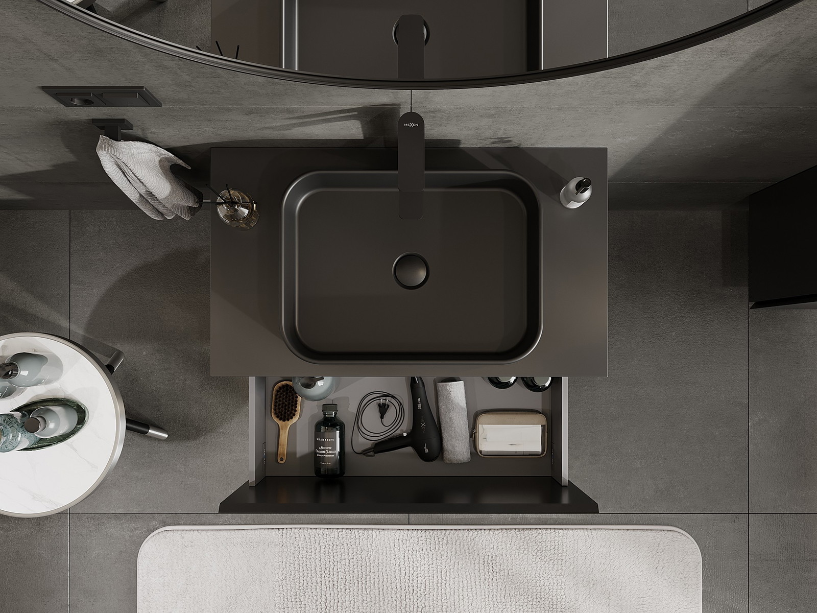 Изрезът в чекмеджето е проектиран по такъв начин, че да побере сифона, който е необходим в мивковите инсталации. Благодарение на това мебелът може да бъде монтиран напълно функционално, без да се налага отказване от пространството в чекмеджето заради инсталацията.