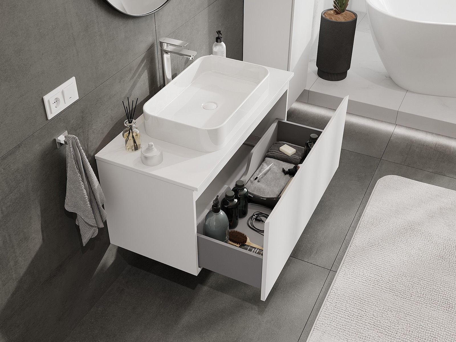 Изрезът в чекмеджето е проектиран по такъв начин, че да побере сифона, който е необходим в мивковите инсталации. Благодарение на това мебелът може да бъде монтиран напълно функционално, без да се налага отказване от пространството в чекмеджето заради инсталацията.