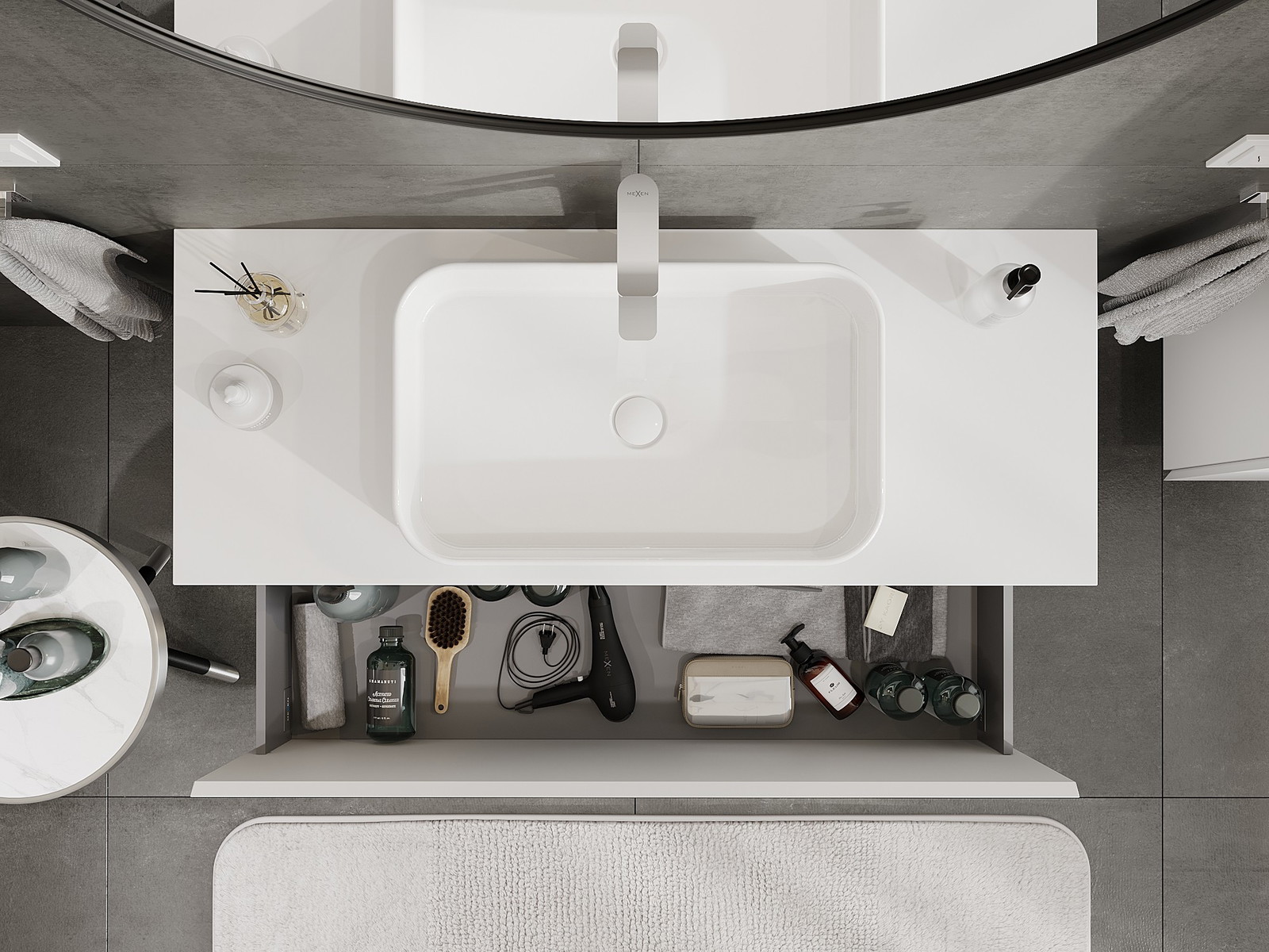 Изрезът в чекмеджето е проектиран по такъв начин, че да побере сифона, който е необходим в мивковите инсталации. Благодарение на това мебелът може да бъде монтиран напълно функционално, без да се налага отказване от пространството в чекмеджето заради инсталацията.