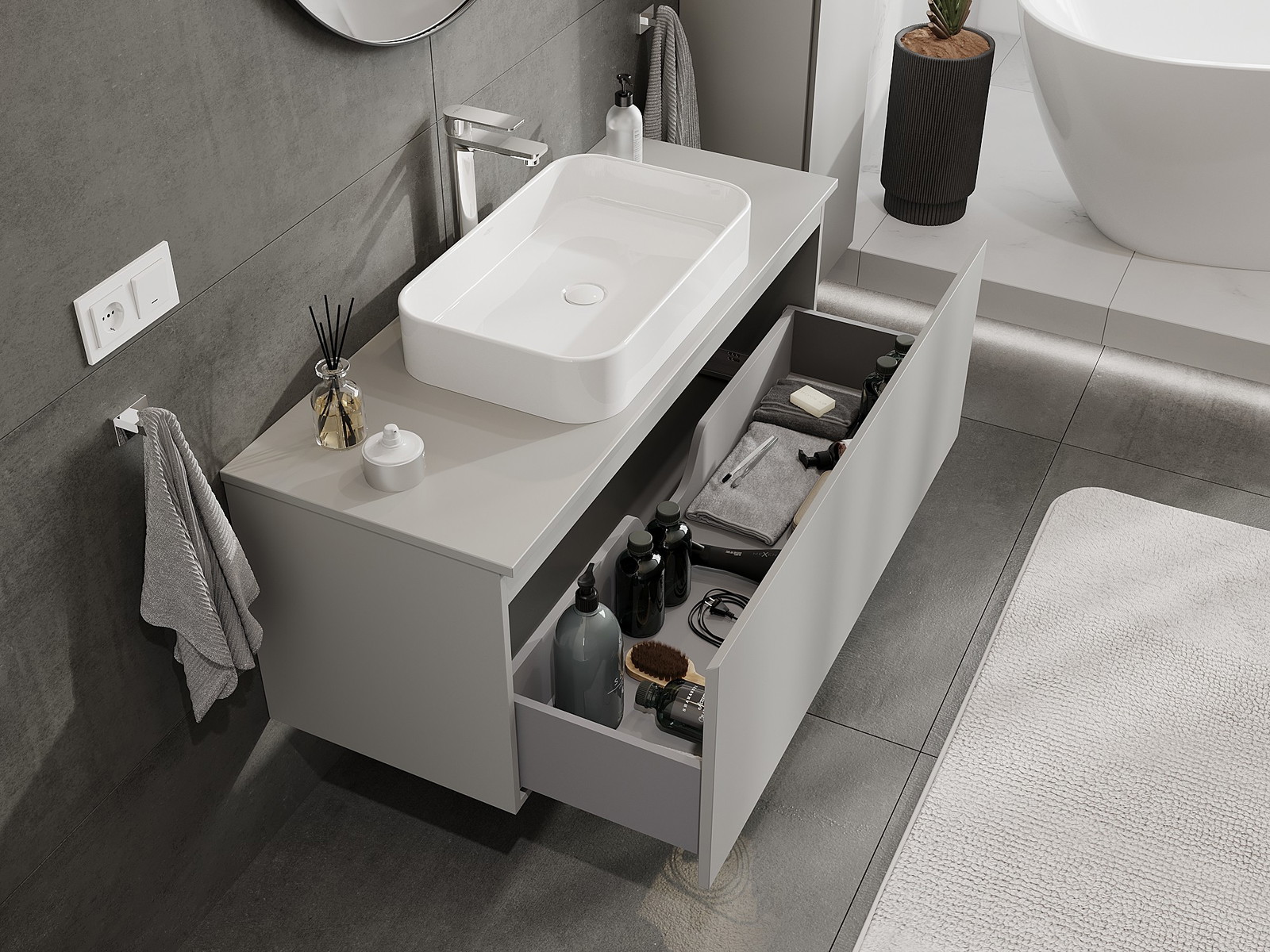 Нашите модулни мебели за баня могат да се комбинират в различни цветови конфигурации, което позволява пълна персонализация. Може да се избере както външният вид, така и функциите на отделните елементи, което позволява съчетаване на мебелите със собствените стилови и функционални предпочитания.