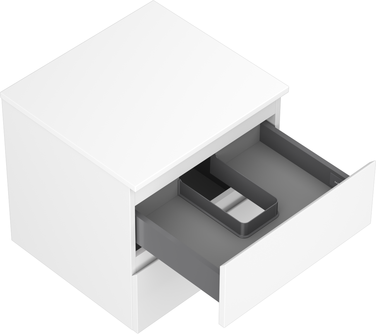 Изрезът в чекмеджето е проектиран по такъв начин, че да побере сифона, който е необходим в мивковите инсталации. Благодарение на това мебелът може да бъде монтиран напълно функционално, без да се налага отказване от пространството в чекмеджето заради инсталацията.