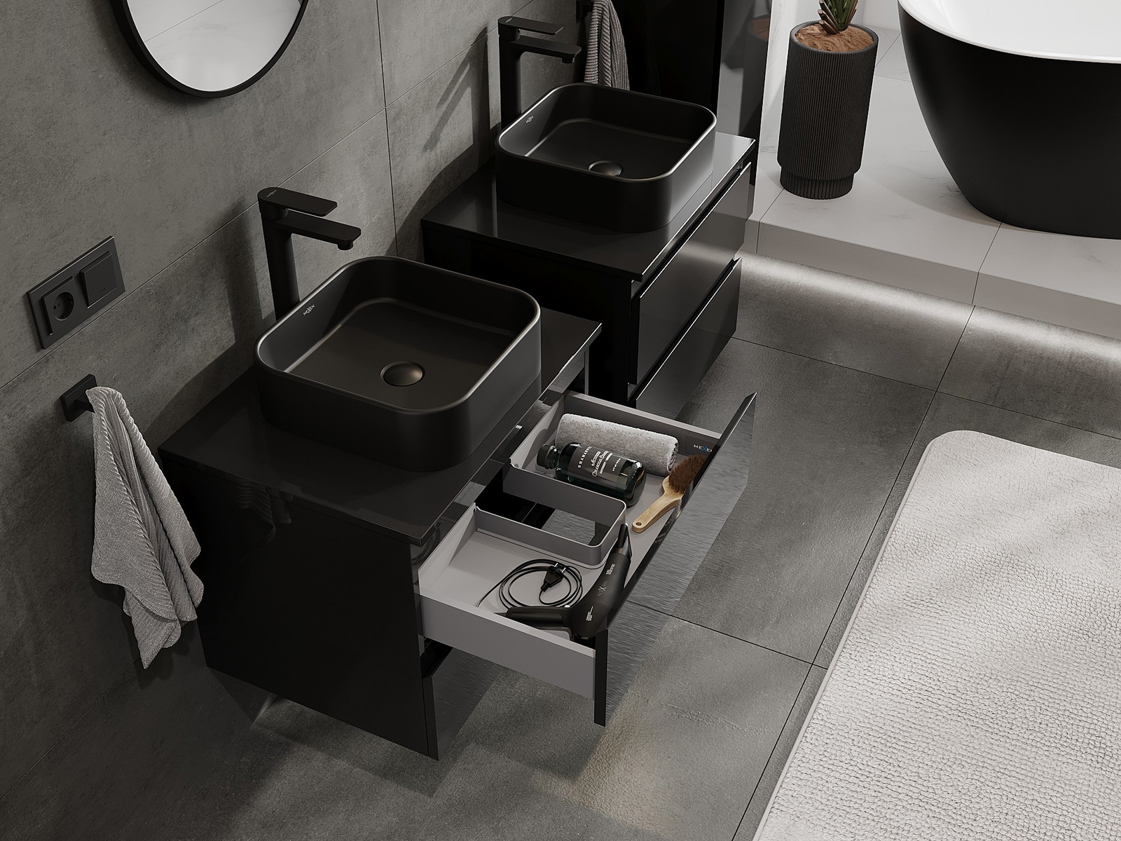 Изрезът в чекмеджето е проектиран по такъв начин, че да побере сифона, който е необходим в мивковите инсталации. Благодарение на това мебелът може да бъде монтиран напълно функционално, без да се налага отказване от пространството в чекмеджето заради инсталацията.