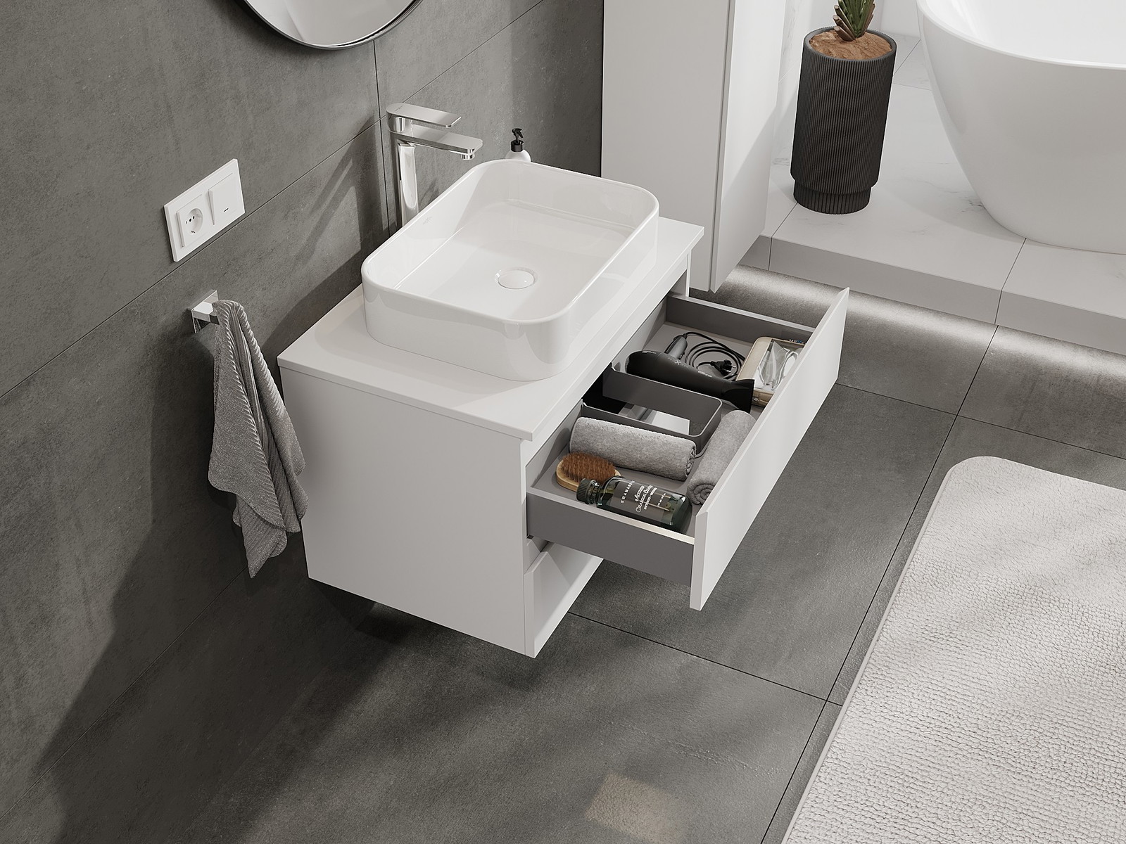 Изрезът в чекмеджето е проектиран по такъв начин, че да побере сифона, който е необходим в мивковите инсталации. Благодарение на това мебелът може да бъде монтиран напълно функционално, без да се налага отказване от пространството в чекмеджето заради инсталацията.