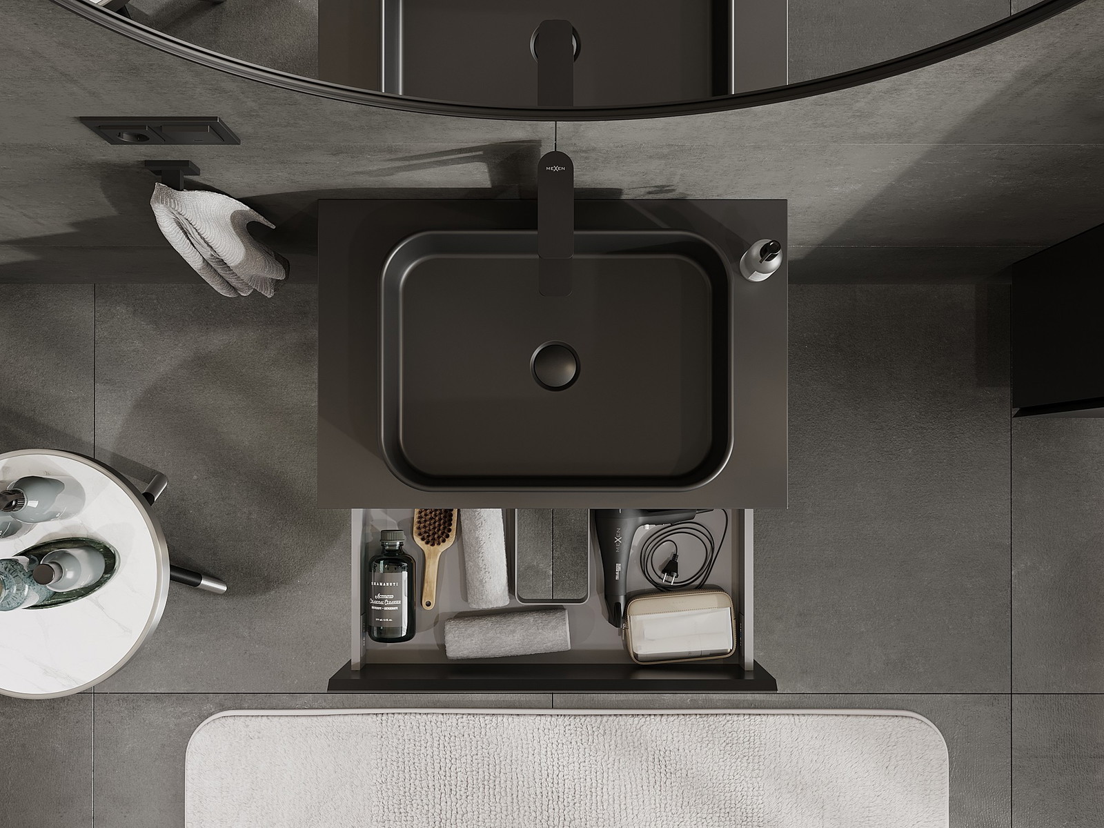 Изрезът в чекмеджето е проектиран по такъв начин, че да побере сифона, който е необходим в мивковите инсталации. Благодарение на това мебелът може да бъде монтиран напълно функционално, без да се налага отказване от пространството в чекмеджето заради инсталацията.