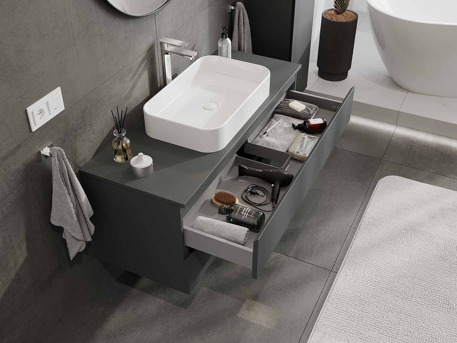 Нашите модулни мебели за баня могат да се комбинират в различни цветови конфигурации, което позволява пълна персонализация. Може да се избере както външният вид, така и функциите на отделните елементи, което позволява съчетаване на мебелите със собствените стилови и функционални предпочитания.