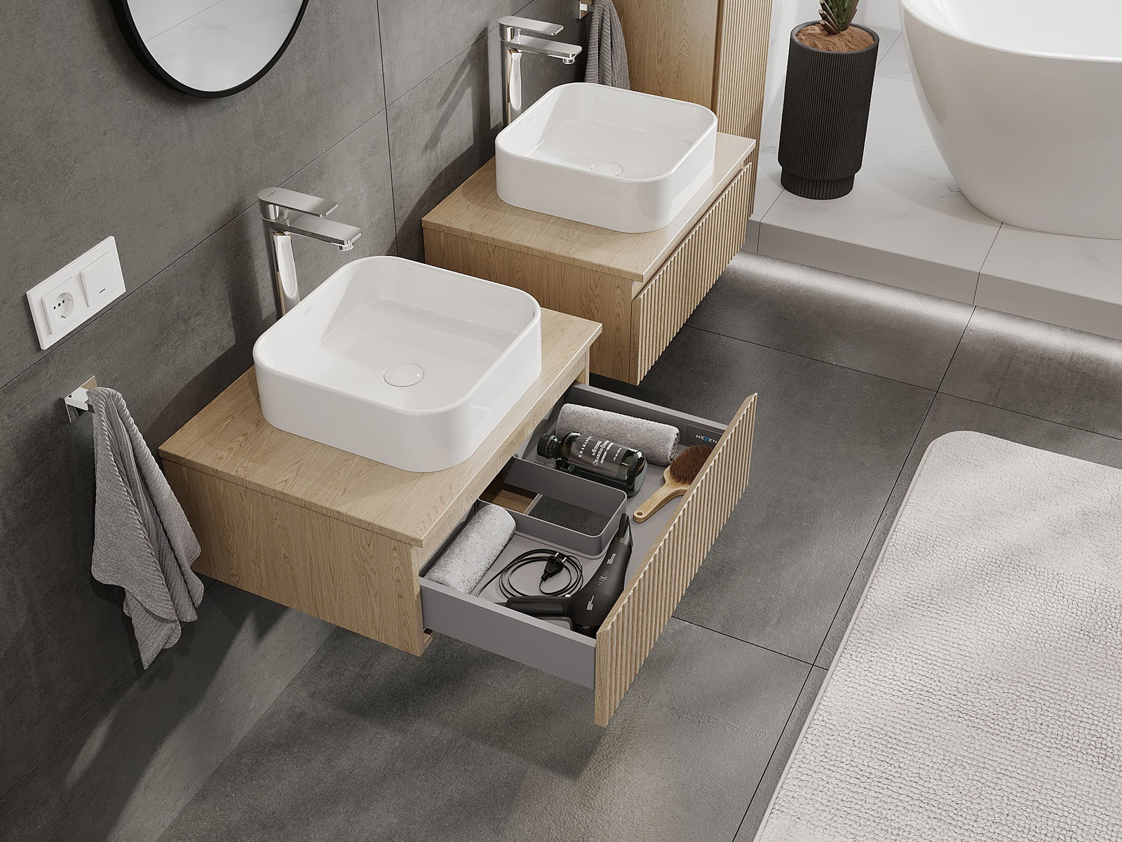 Нашите модулни мебели за баня могат да се комбинират в различни цветови конфигурации, което позволява пълна персонализация. Може да се избере както външният вид, така и функциите на отделните елементи, което позволява съчетаване на мебелите със собствените стилови и функционални предпочитания.