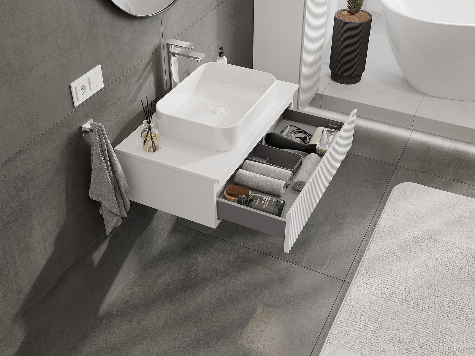 Изрезът в чекмеджето е проектиран по такъв начин, че да побере сифона, който е необходим в мивковите инсталации. Благодарение на това мебелът може да бъде монтиран напълно функционално, без да се налага отказване от пространството в чекмеджето заради инсталацията.