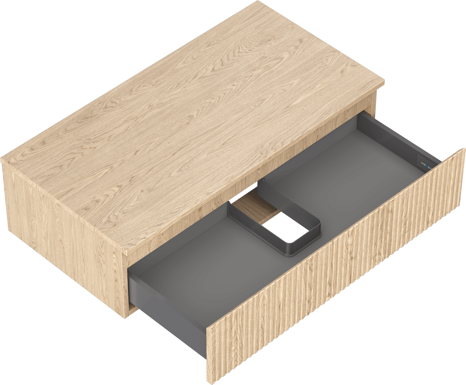 Изрезът в чекмеджето е проектиран по такъв начин, че да побере сифона, който е необходим в мивковите инсталации. Благодарение на това мебелът може да бъде монтиран напълно функционално, без да се налага отказване от пространството в чекмеджето заради инсталацията.