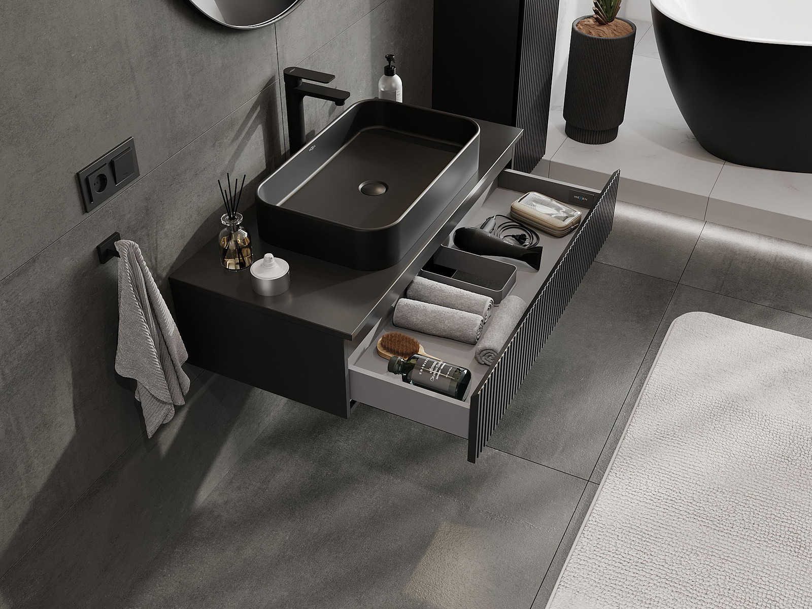 Изрезът в чекмеджето е проектиран по такъв начин, че да побере сифона, който е необходим в мивковите инсталации. Благодарение на това мебелът може да бъде монтиран напълно функционално, без да се налага отказване от пространството в чекмеджето заради инсталацията.