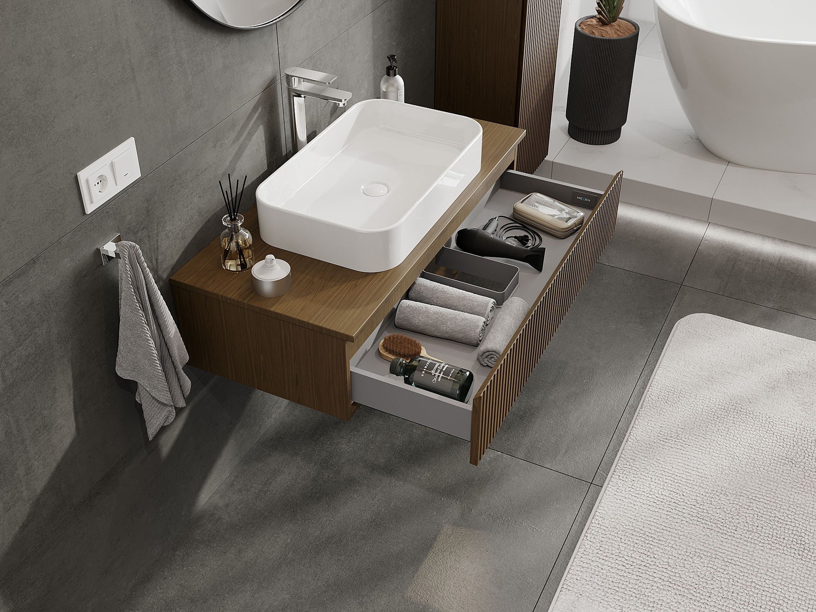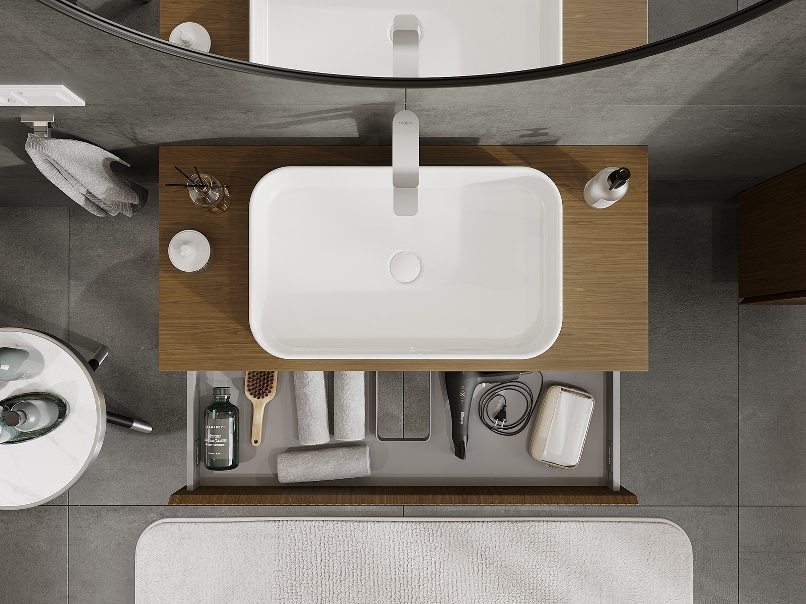 Изрезът в чекмеджето е проектиран по такъв начин, че да побере сифона, който е необходим в мивковите инсталации. Благодарение на това мебелът може да бъде монтиран напълно функционално, без да се налага отказване от пространството в чекмеджето заради инсталацията.