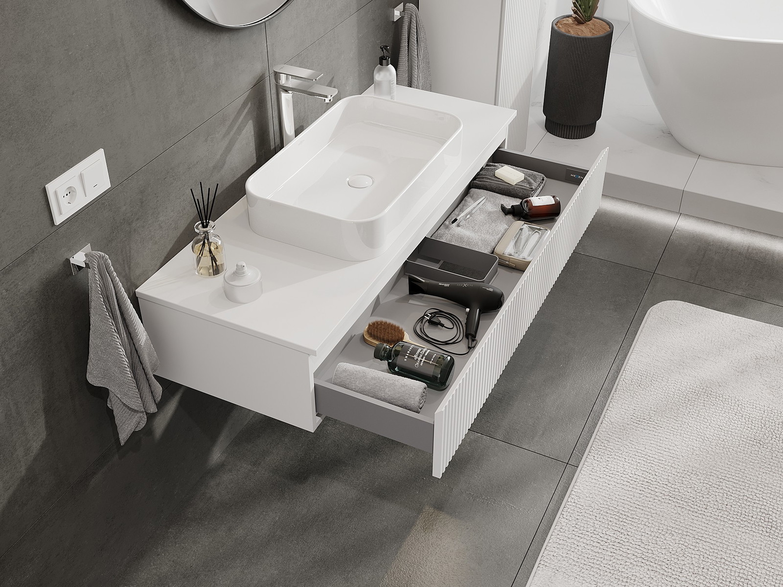 Изрезът в чекмеджето е проектиран по такъв начин, че да побере сифона, който е необходим в мивковите инсталации. Благодарение на това мебелът може да бъде монтиран напълно функционално, без да се налага отказване от пространството в чекмеджето заради инсталацията.