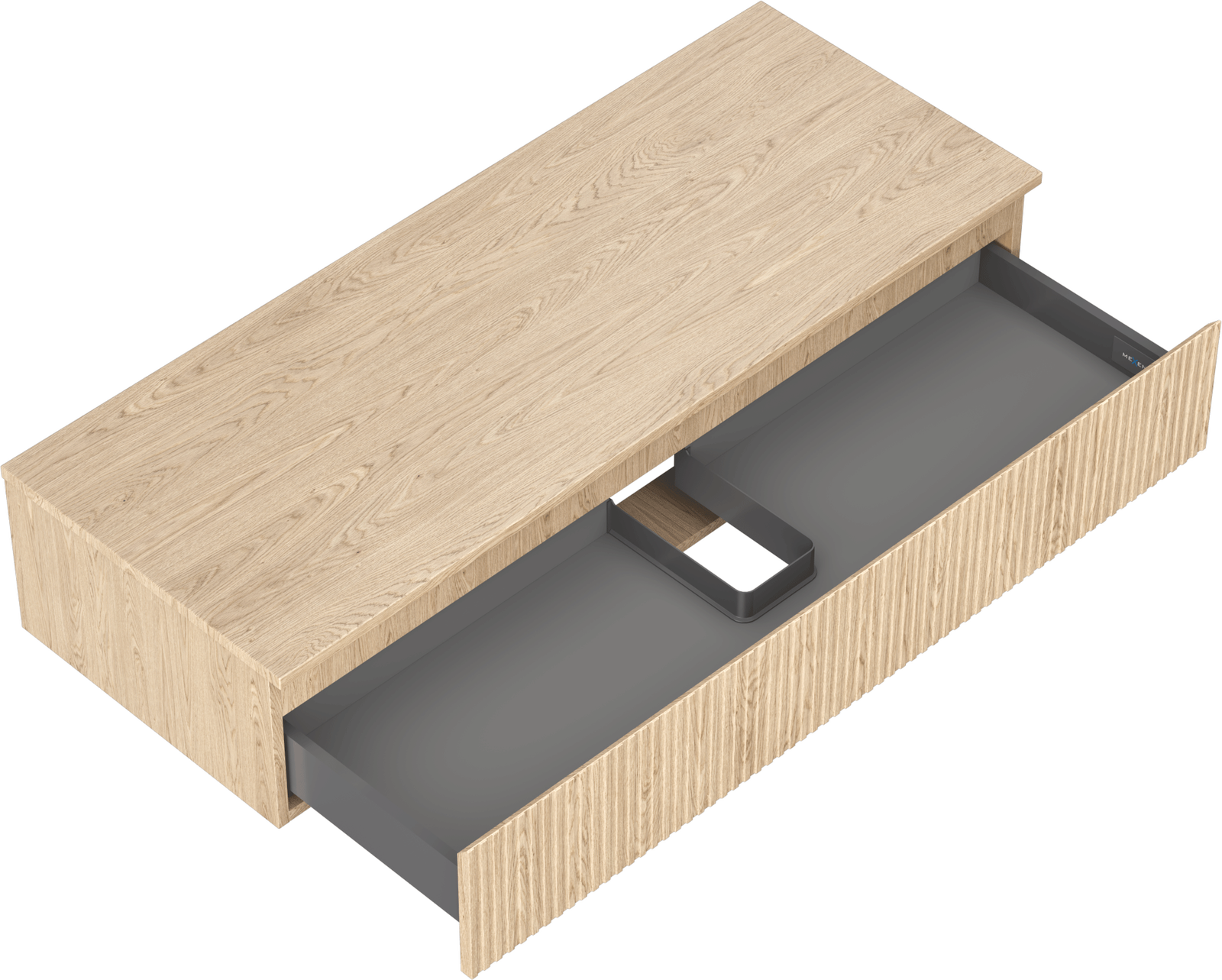Изрезът в чекмеджето е проектиран по такъв начин, че да побере сифона, който е необходим в мивковите инсталации. Благодарение на това мебелът може да бъде монтиран напълно функционално, без да се налага отказване от пространството в чекмеджето заради инсталацията.