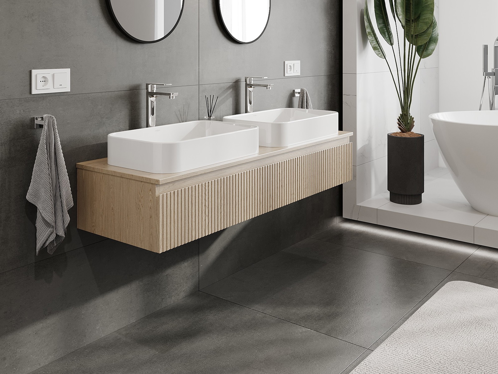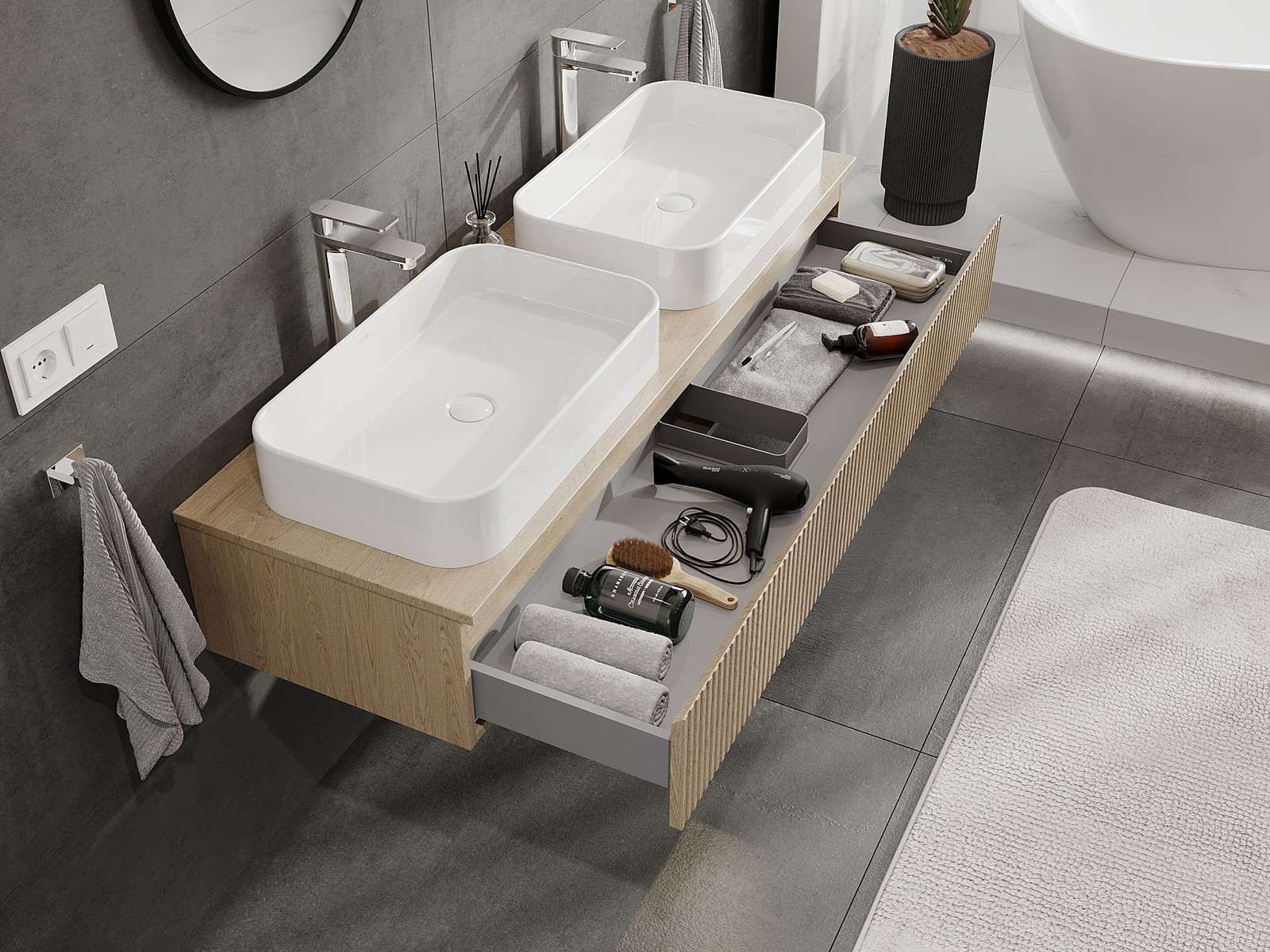 Нашите модулни мебели за баня могат да се комбинират в различни цветови конфигурации, което позволява пълна персонализация. Може да се избере както външният вид, така и функциите на отделните елементи, което позволява съчетаване на мебелите със собствените стилови и функционални предпочитания.