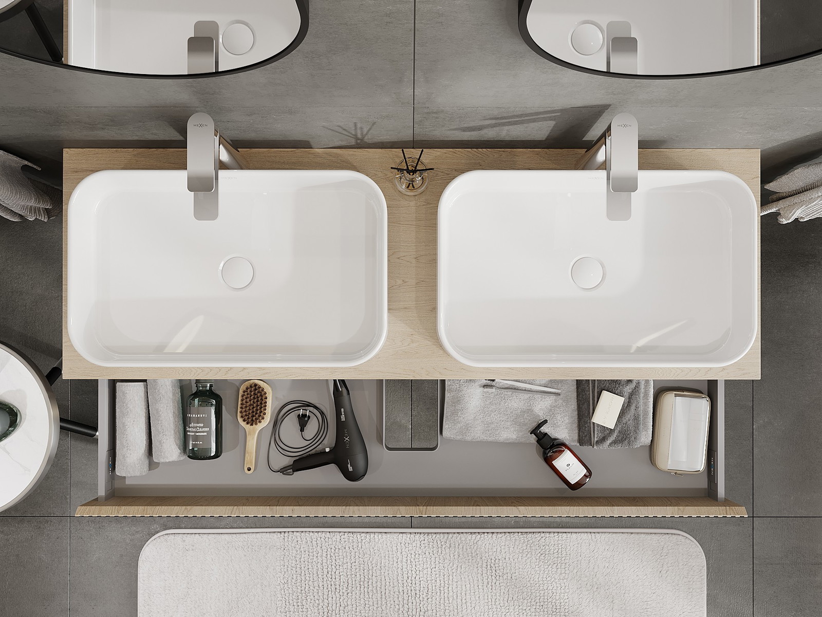 Изрезът в чекмеджето е проектиран по такъв начин, че да побере сифона, който е необходим в мивковите инсталации. Благодарение на това мебелът може да бъде монтиран напълно функционално, без да се налага отказване от пространството в чекмеджето заради инсталацията.