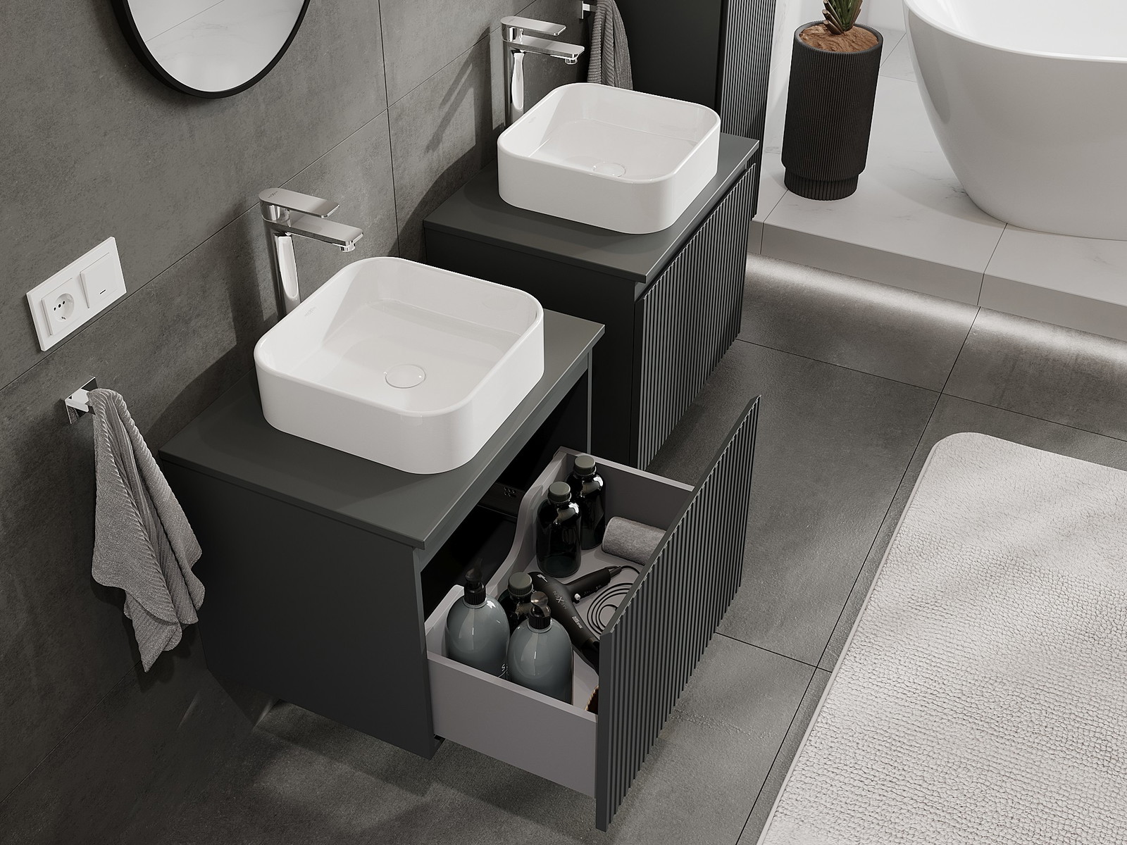 Нашите модулни мебели за баня могат да се комбинират в различни цветови конфигурации, което позволява пълна персонализация. Може да се избере както външният вид, така и функциите на отделните елементи, което позволява съчетаване на мебелите със собствените стилови и функционални предпочитания.