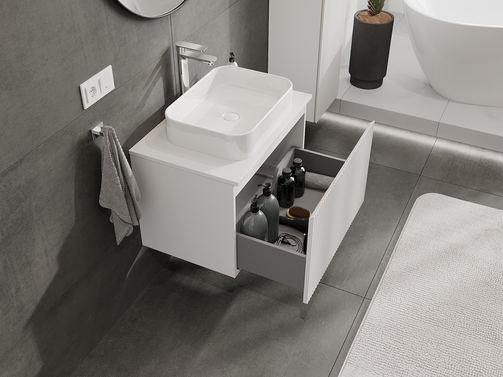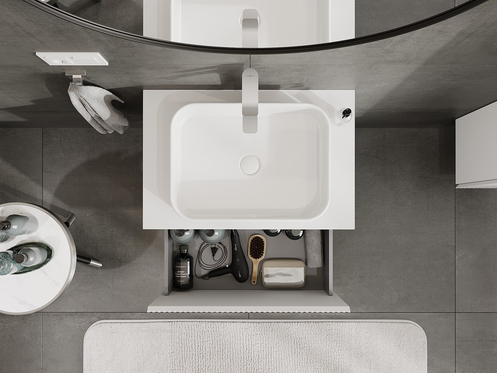Изрезът в чекмеджето е проектиран по такъв начин, че да побере сифона, който е необходим в мивковите инсталации. Благодарение на това мебелът може да бъде монтиран напълно функционално, без да се налага отказване от пространството в чекмеджето заради инсталацията.