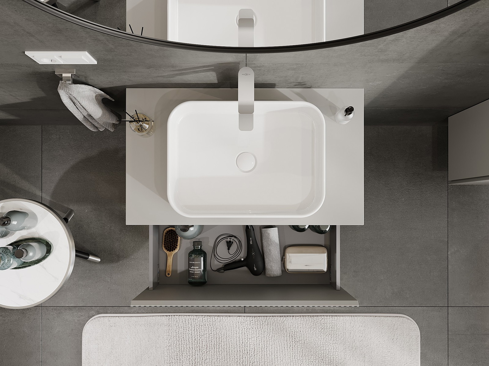 Изрезът в чекмеджето е проектиран по такъв начин, че да побере сифона, който е необходим в мивковите инсталации. Благодарение на това мебелът може да бъде монтиран напълно функционално, без да се налага отказване от пространството в чекмеджето заради инсталацията.