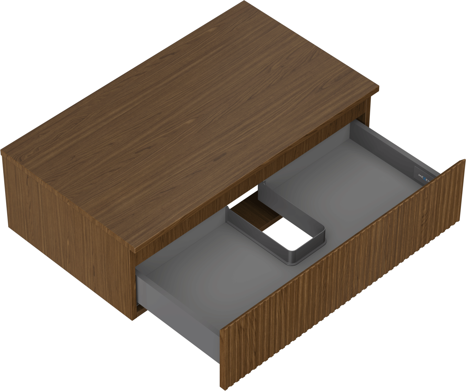 Изрезът в чекмеджето е проектиран по такъв начин, че да побере сифона, който е необходим в мивковите инсталации. Благодарение на това мебелът може да бъде монтиран напълно функционално, без да се налага отказване от пространството в чекмеджето заради инсталацията.