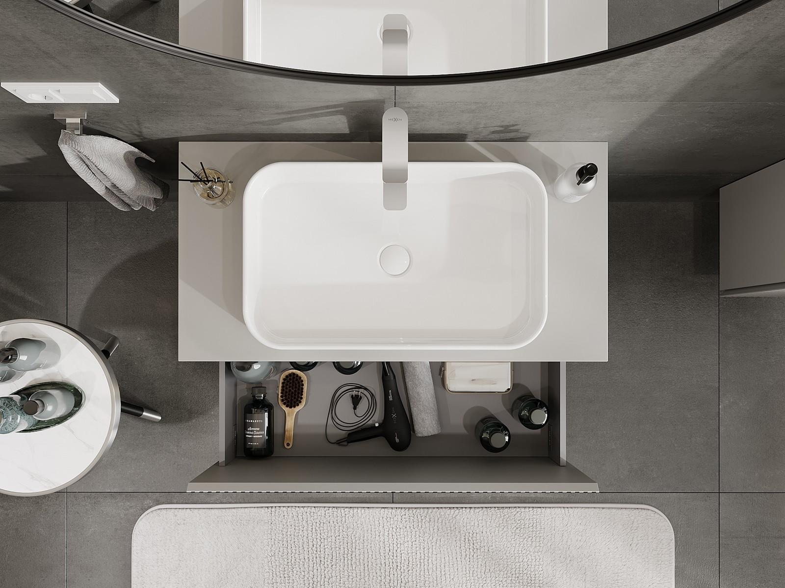 Изрезът в чекмеджето е проектиран по такъв начин, че да побере сифона, който е необходим в мивковите инсталации. Благодарение на това мебелът може да бъде монтиран напълно функционално, без да се налага отказване от пространството в чекмеджето заради инсталацията.
