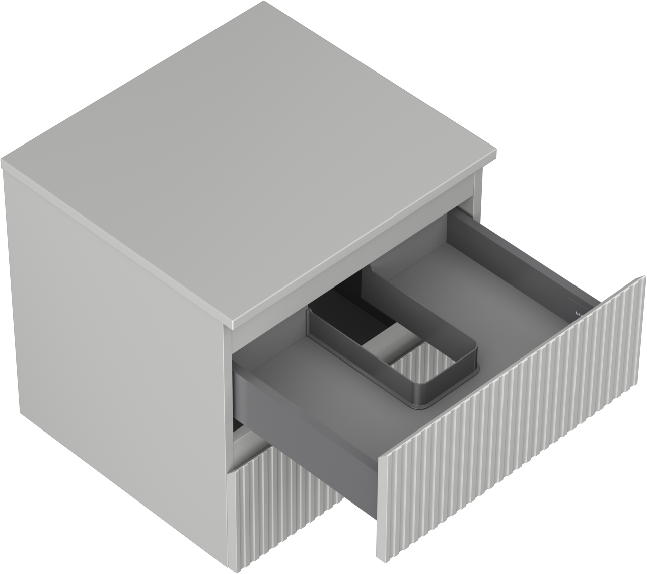 Изрезът в чекмеджето е проектиран по такъв начин, че да побере сифона, който е необходим в мивковите инсталации. Благодарение на това мебелът може да бъде монтиран напълно функционално, без да се налага отказване от пространството в чекмеджето заради инсталацията.