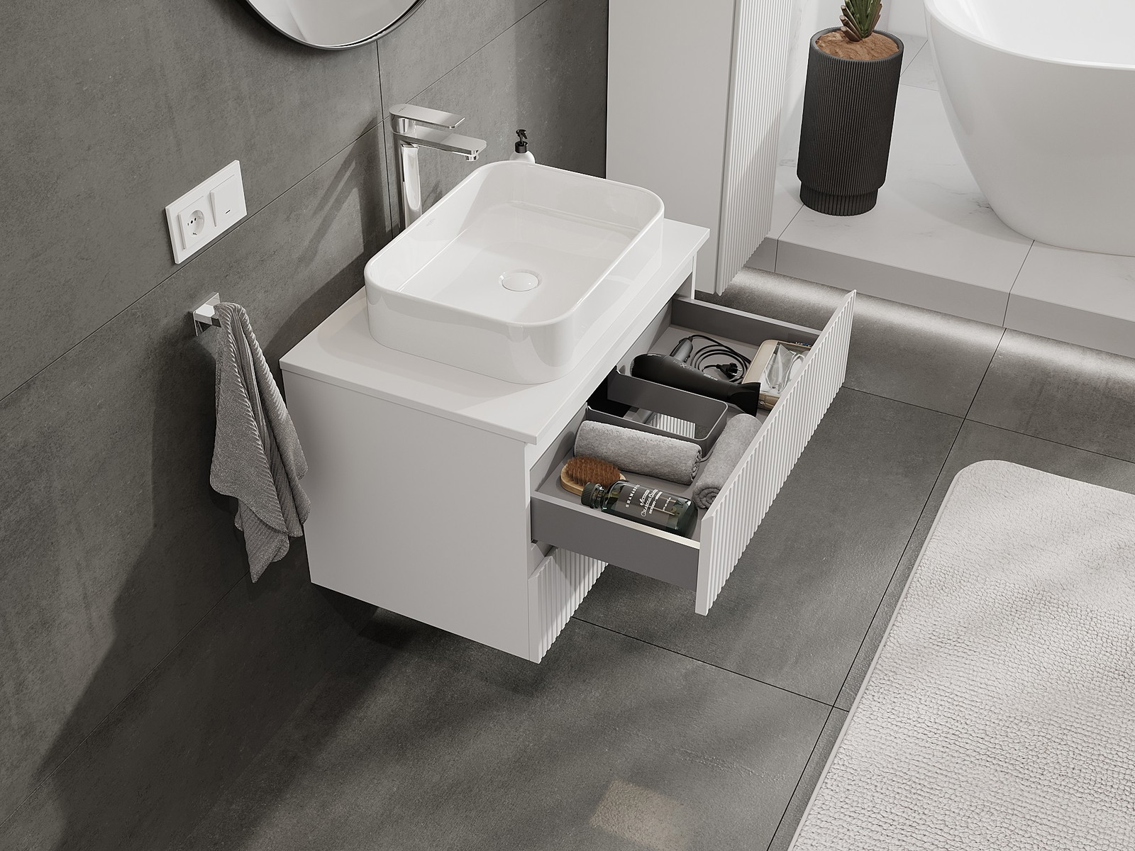 Нашите модулни мебели за баня могат да се комбинират в различни цветови конфигурации, което позволява пълна персонализация. Може да се избере както външният вид, така и функциите на отделните елементи, което позволява съчетаване на мебелите със собствените стилови и функционални предпочитания.