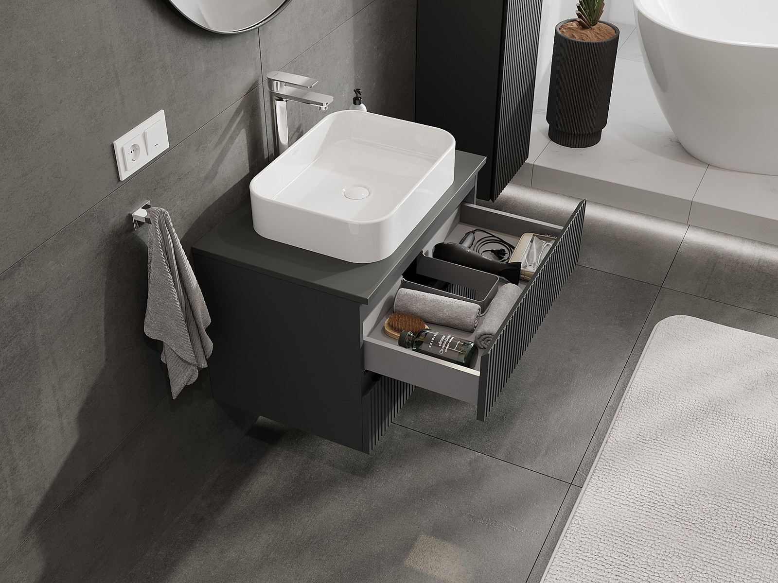 Нашите модулни мебели за баня могат да се комбинират в различни цветови конфигурации, което позволява пълна персонализация. Може да се избере както външният вид, така и функциите на отделните елементи, което позволява съчетаване на мебелите със собствените стилови и функционални предпочитания.