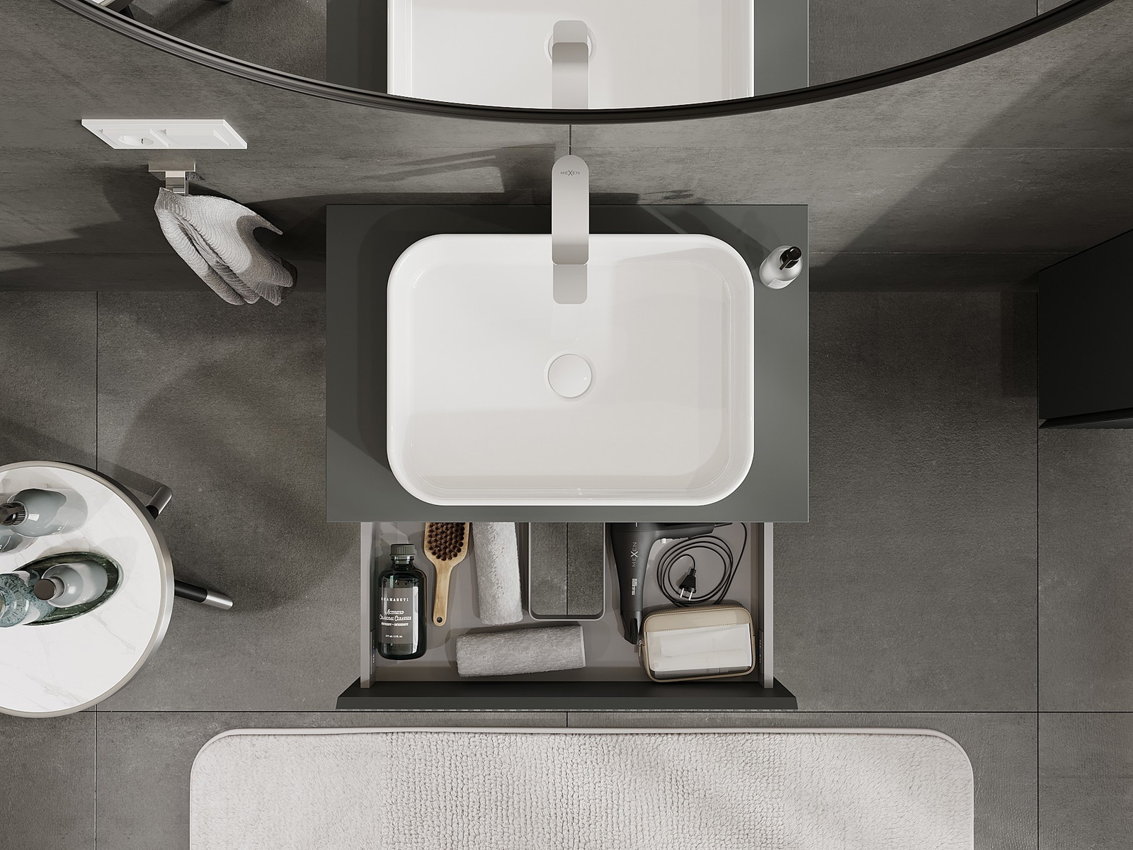 Изрезът в чекмеджето е проектиран по такъв начин, че да побере сифона, който е необходим в мивковите инсталации. Благодарение на това мебелът може да бъде монтиран напълно функционално, без да се налага отказване от пространството в чекмеджето заради инсталацията.