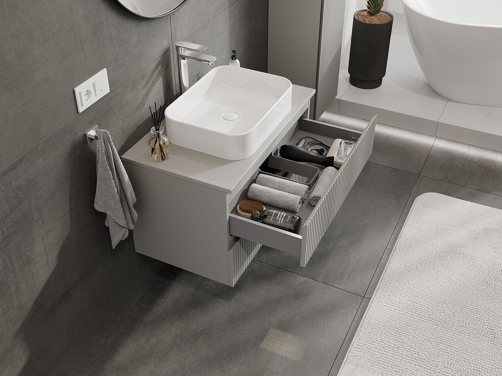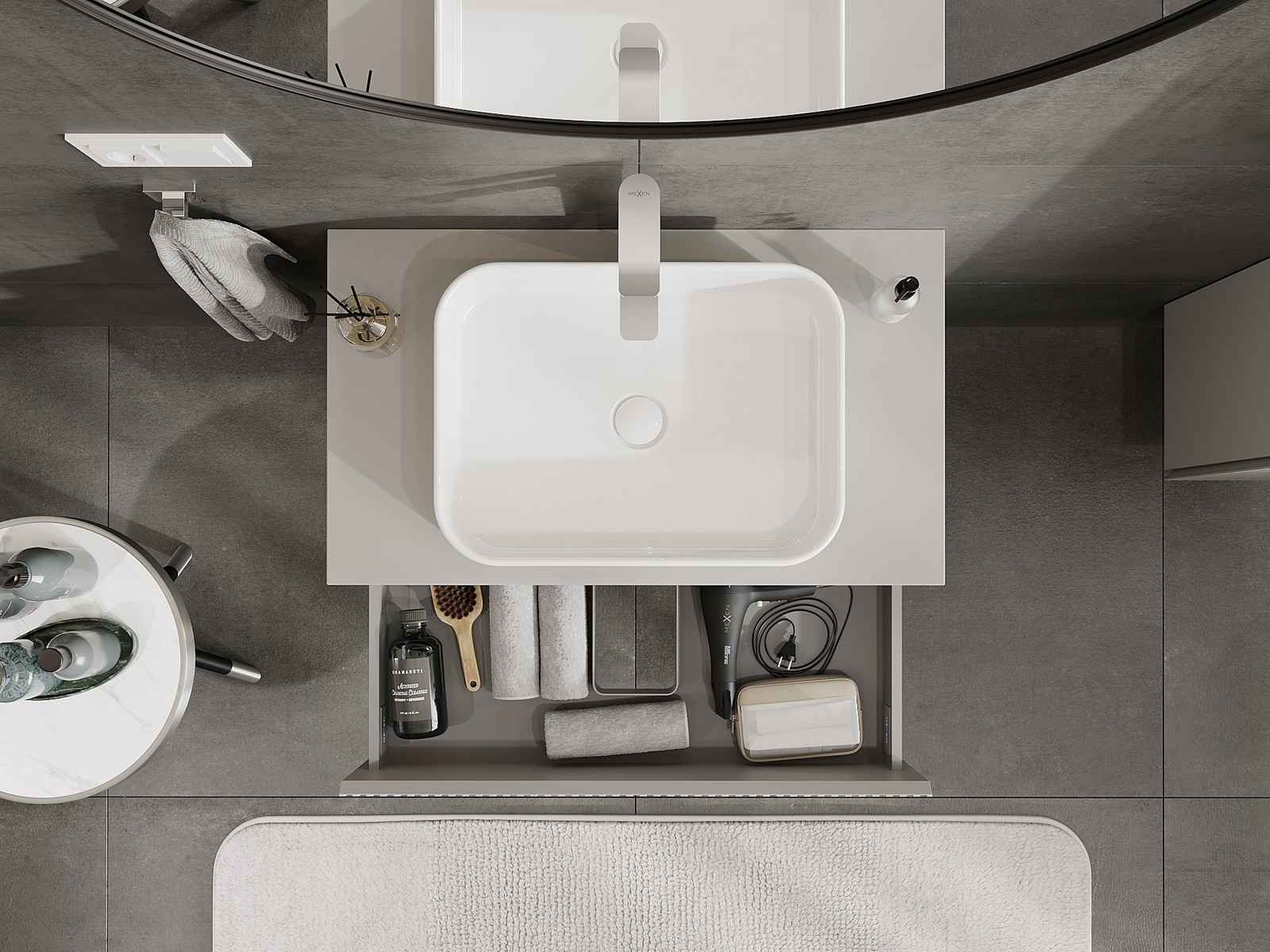 Изрезът в чекмеджето е проектиран по такъв начин, че да побере сифона, който е необходим в мивковите инсталации. Благодарение на това мебелът може да бъде монтиран напълно функционално, без да се налага отказване от пространството в чекмеджето заради инсталацията.