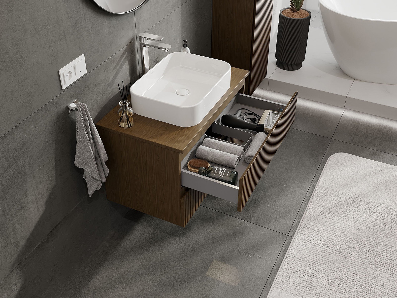 Изрезът в чекмеджето е проектиран по такъв начин, че да побере сифона, който е необходим в мивковите инсталации. Благодарение на това мебелът може да бъде монтиран напълно функционално, без да се налага отказване от пространството в чекмеджето заради инсталацията.