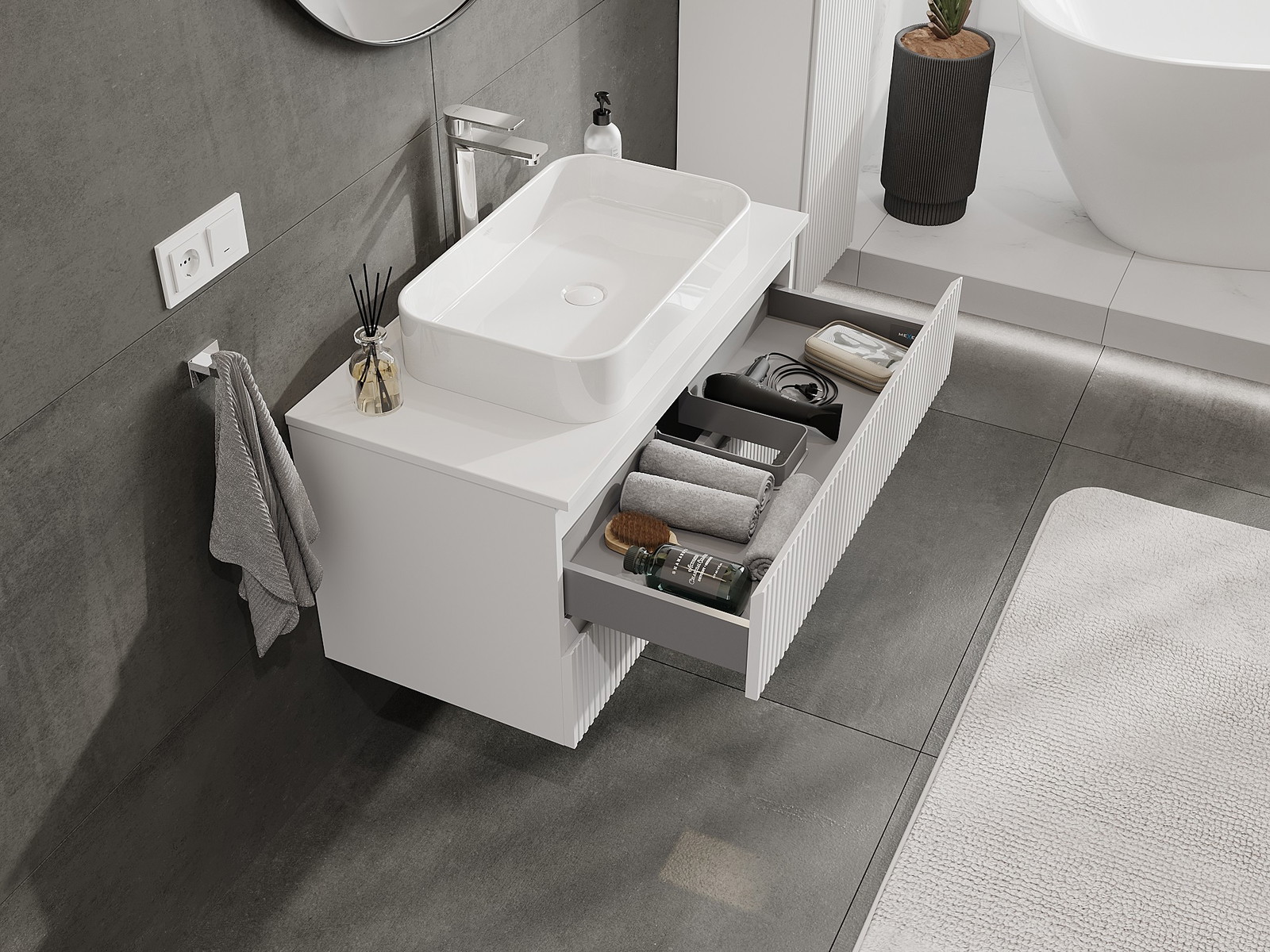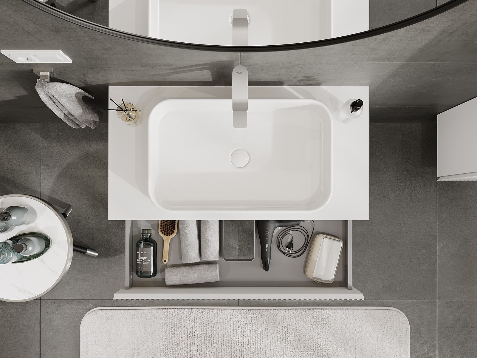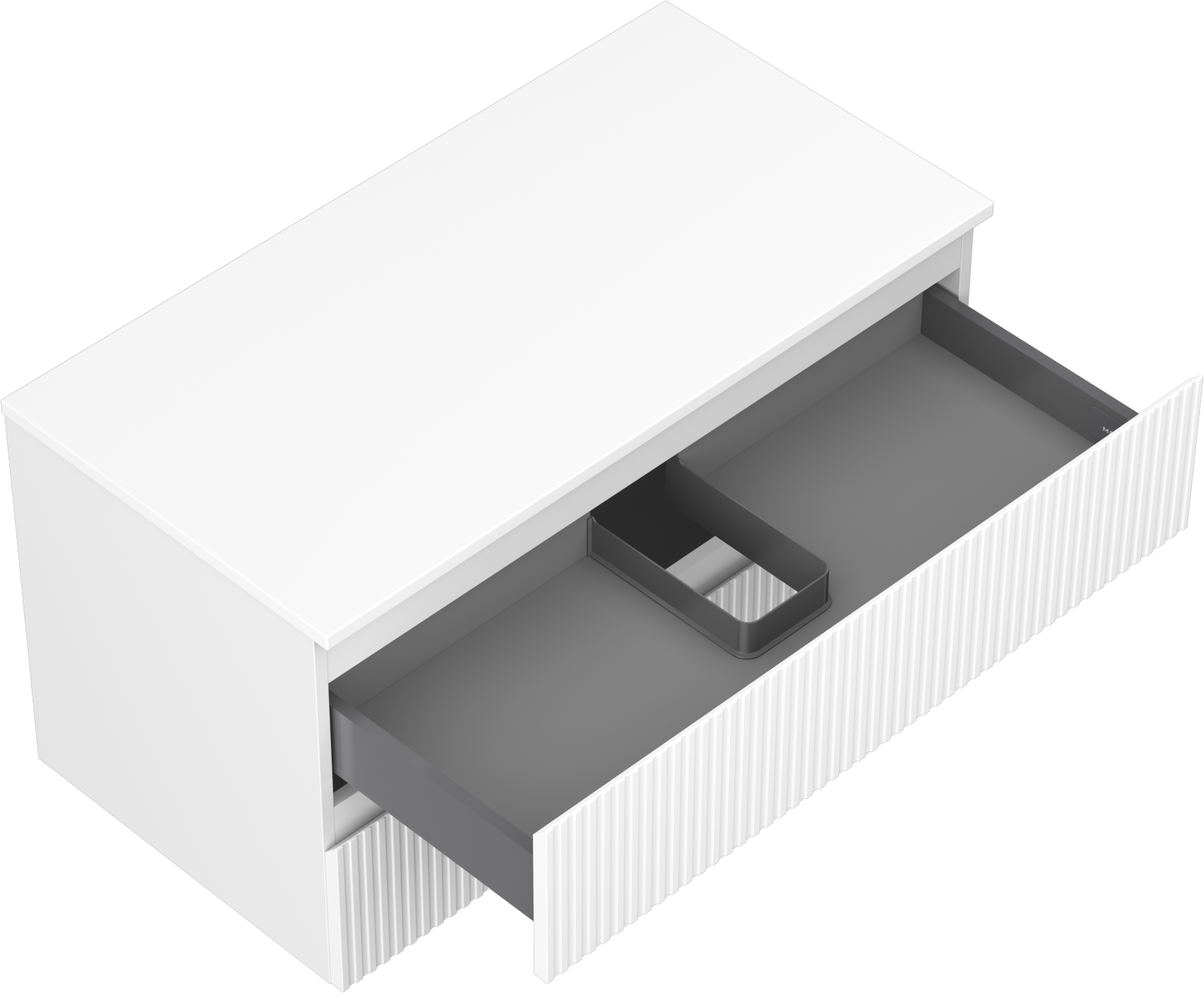 Изрезът в чекмеджето е проектиран по такъв начин, че да побере сифона, който е необходим в мивковите инсталации. Благодарение на това мебелът може да бъде монтиран напълно функционално, без да се налага отказване от пространството в чекмеджето заради инсталацията.