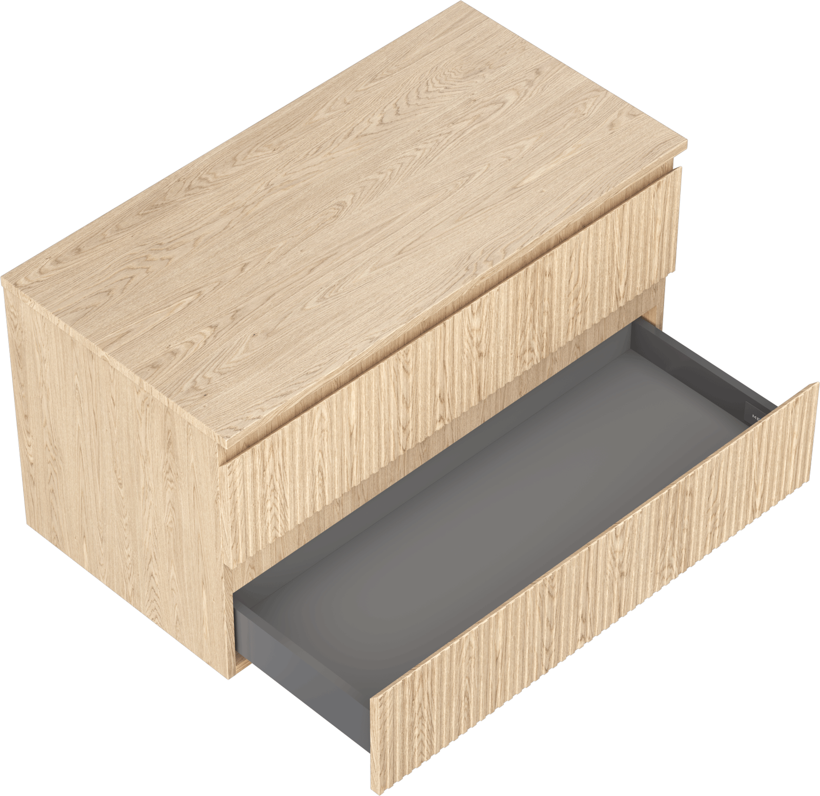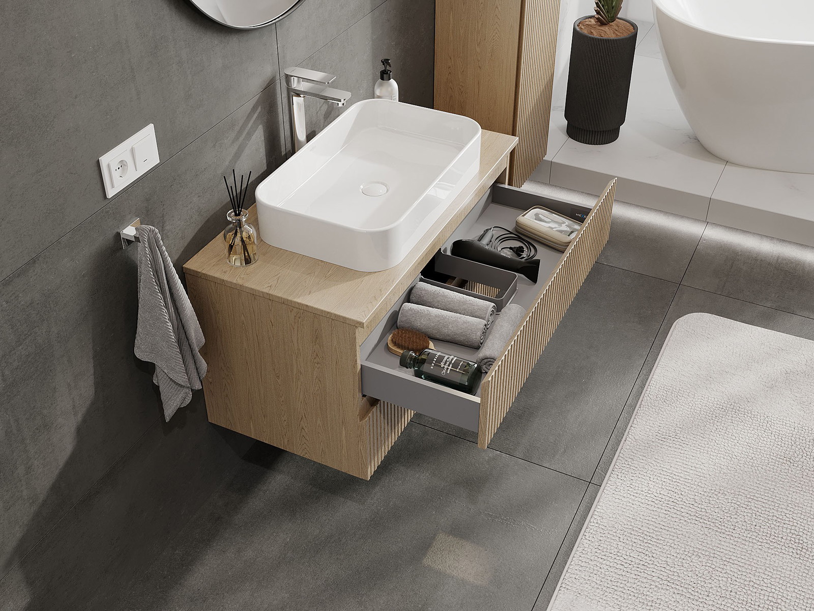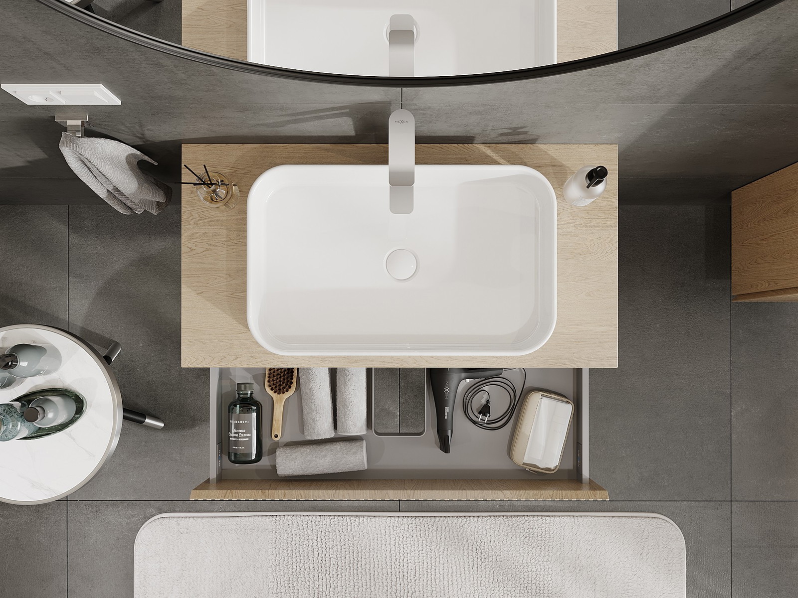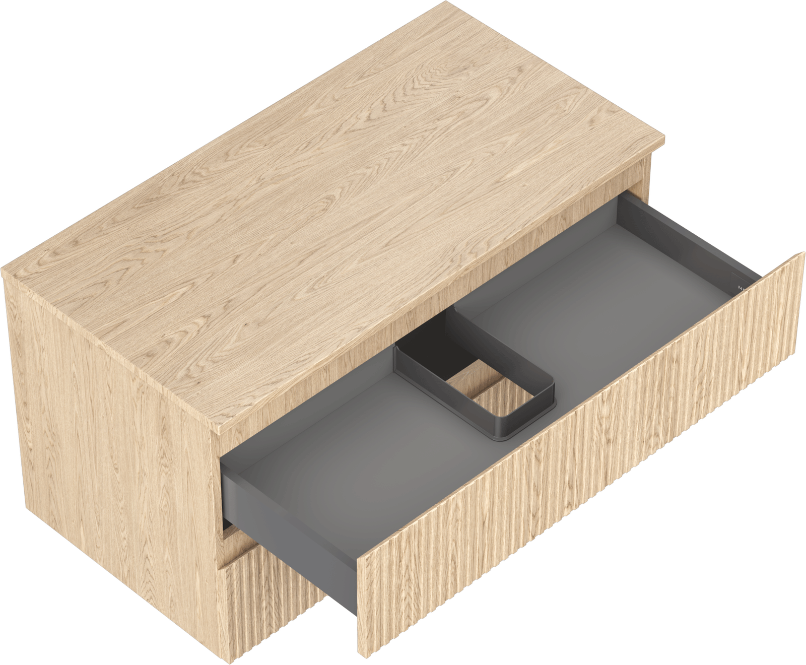Изрезът в чекмеджето е проектиран по такъв начин, че да побере сифона, който е необходим в мивковите инсталации. Благодарение на това мебелът може да бъде монтиран напълно функционално, без да се налага отказване от пространството в чекмеджето заради инсталацията.