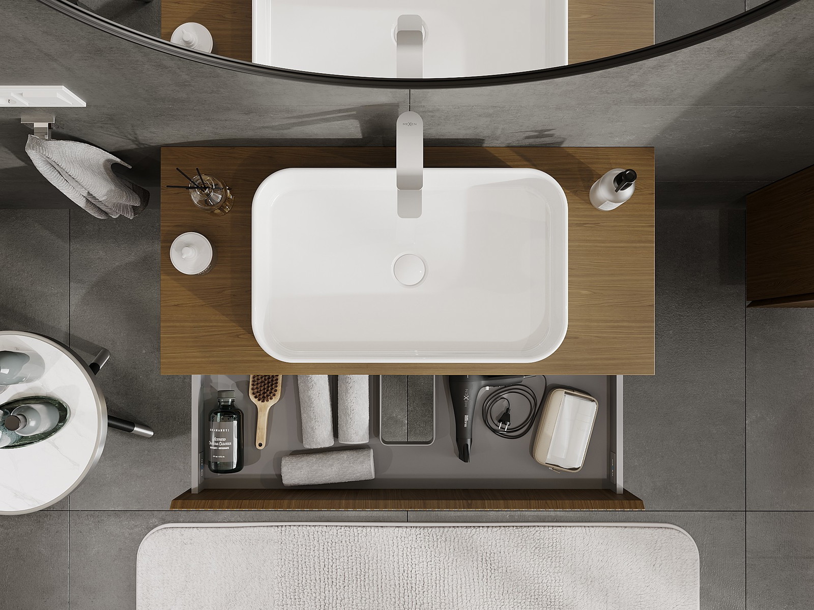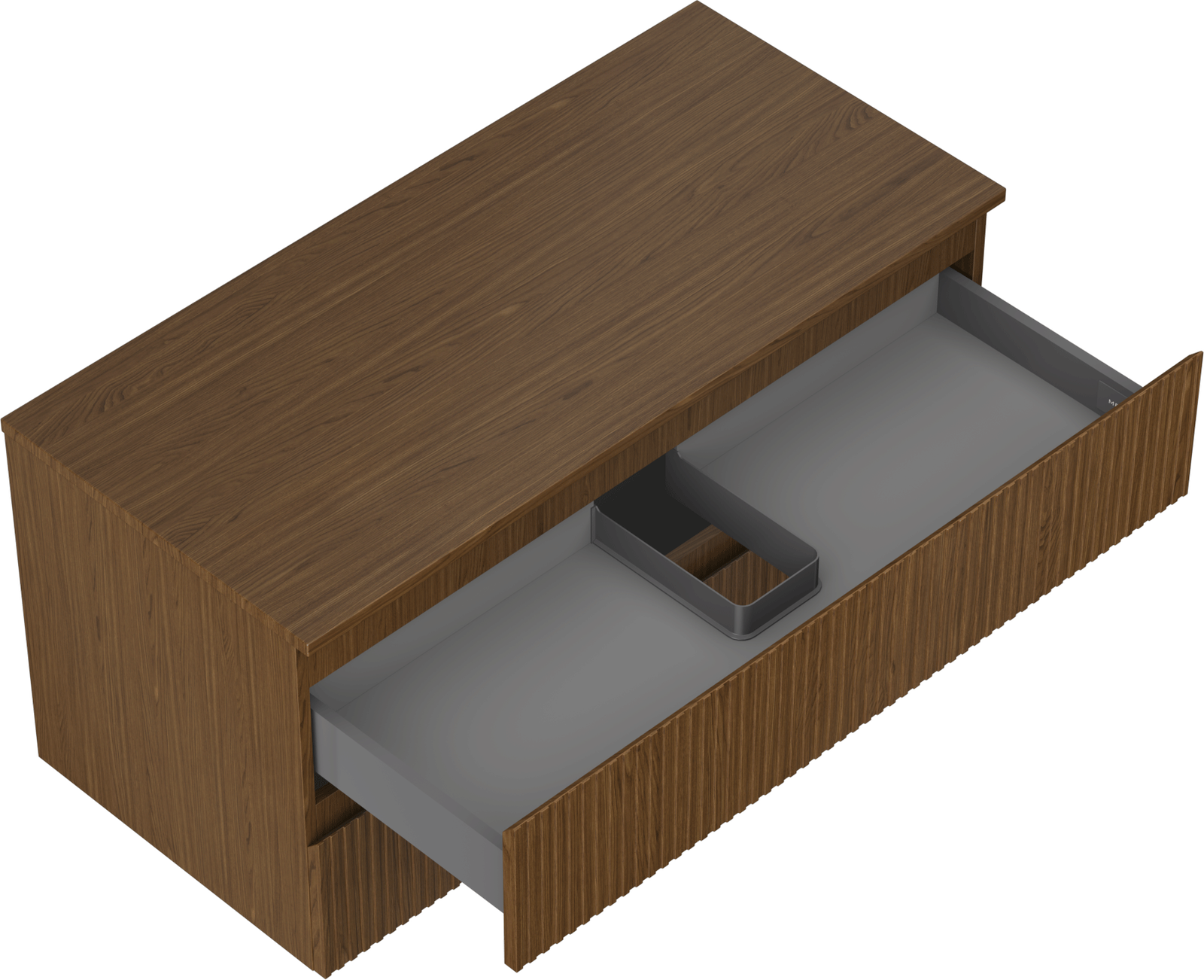 Изрезът в чекмеджето е проектиран по такъв начин, че да побере сифона, който е необходим в мивковите инсталации. Благодарение на това мебелът може да бъде монтиран напълно функционално, без да се налага отказване от пространството в чекмеджето заради инсталацията.