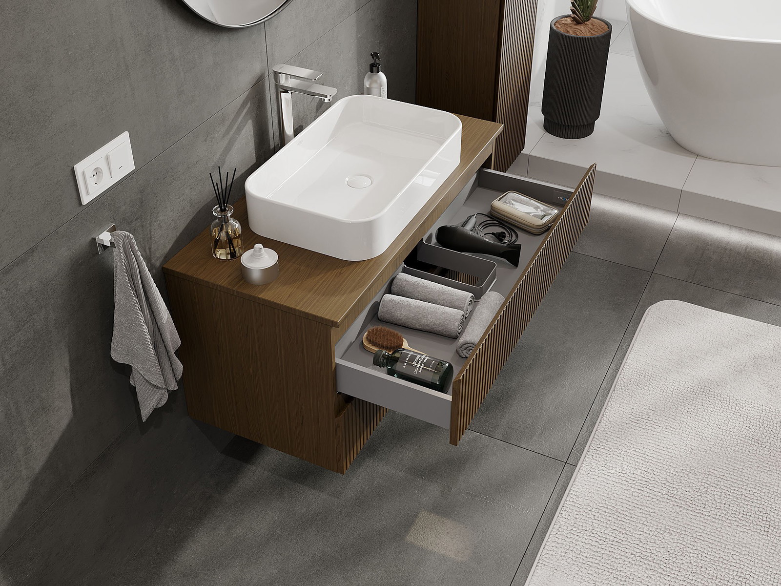 Нашите модулни мебели за баня могат да се комбинират в различни цветови конфигурации, което позволява пълна персонализация. Може да се избере както външният вид, така и функциите на отделните елементи, което позволява съчетаване на мебелите със собствените стилови и функционални предпочитания.