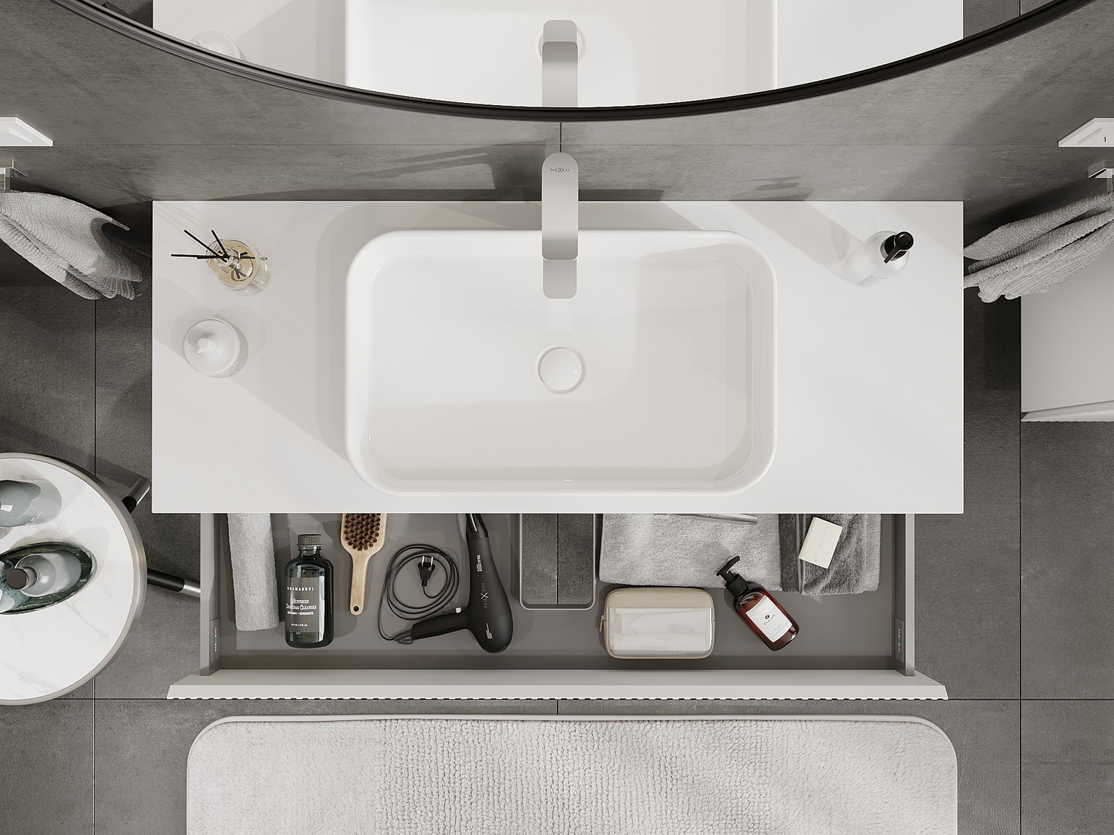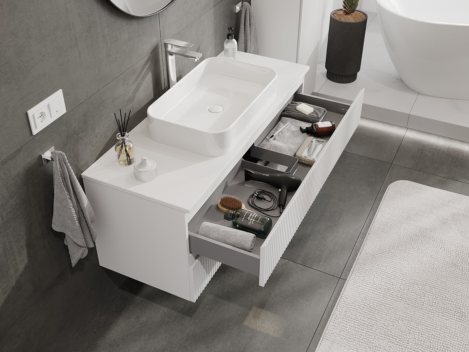 Изрезът в чекмеджето е проектиран по такъв начин, че да побере сифона, който е необходим в мивковите инсталации. Благодарение на това мебелът може да бъде монтиран напълно функционално, без да се налага отказване от пространството в чекмеджето заради инсталацията.