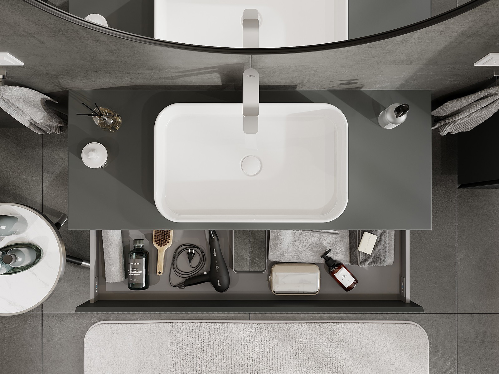 Изрезът в чекмеджето е проектиран по такъв начин, че да побере сифона, който е необходим в мивковите инсталации. Благодарение на това мебелът може да бъде монтиран напълно функционално, без да се налага отказване от пространството в чекмеджето заради инсталацията.