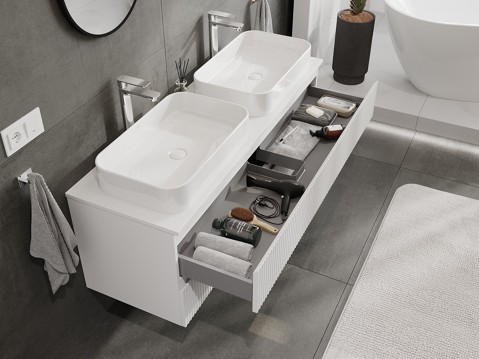 Изрезът в чекмеджето е проектиран по такъв начин, че да побере сифона, който е необходим в мивковите инсталации. Благодарение на това мебелът може да бъде монтиран напълно функционално, без да се налага отказване от пространството в чекмеджето заради инсталацията.
