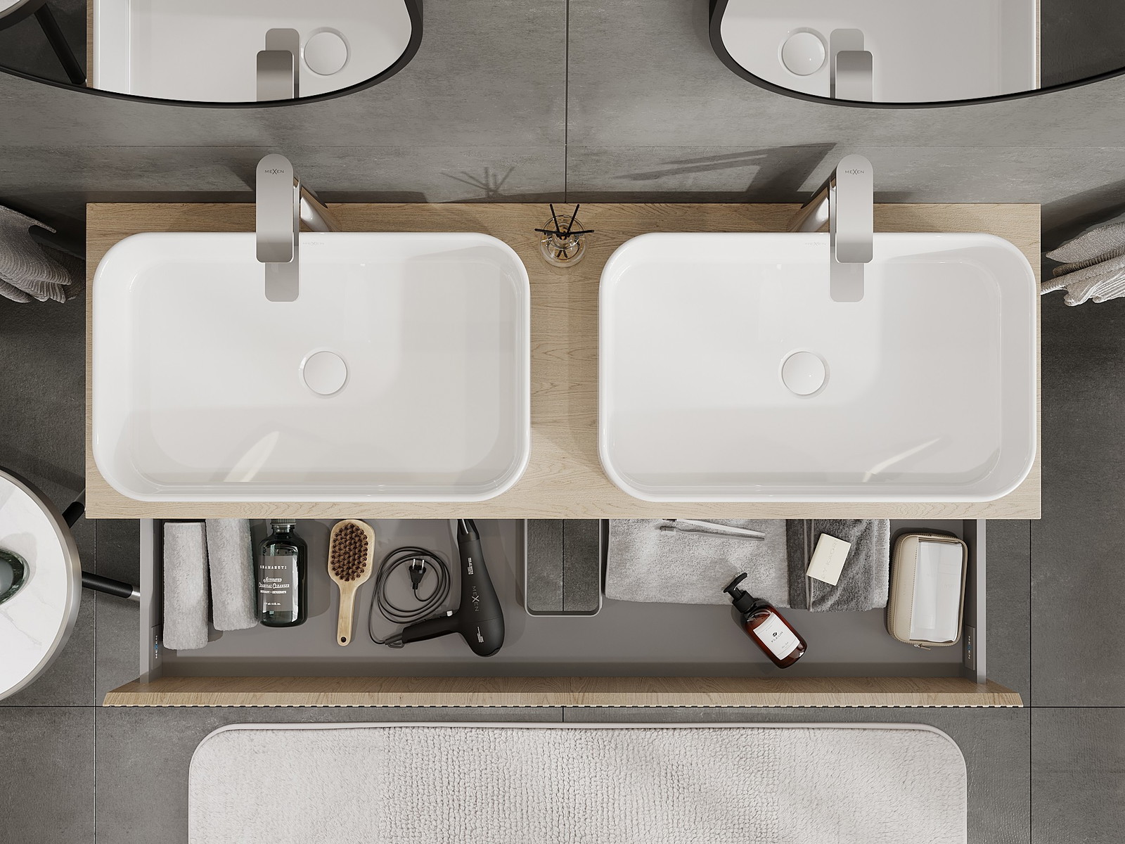 Нашите модулни мебели за баня могат да се комбинират в различни цветови конфигурации, което позволява пълна персонализация. Може да се избере както външният вид, така и функциите на отделните елементи, което позволява съчетаване на мебелите със собствените стилови и функционални предпочитания.