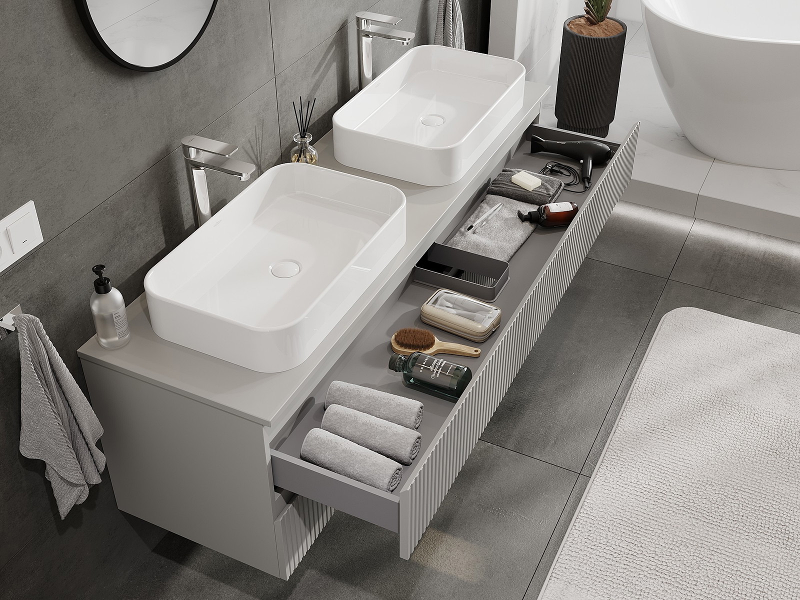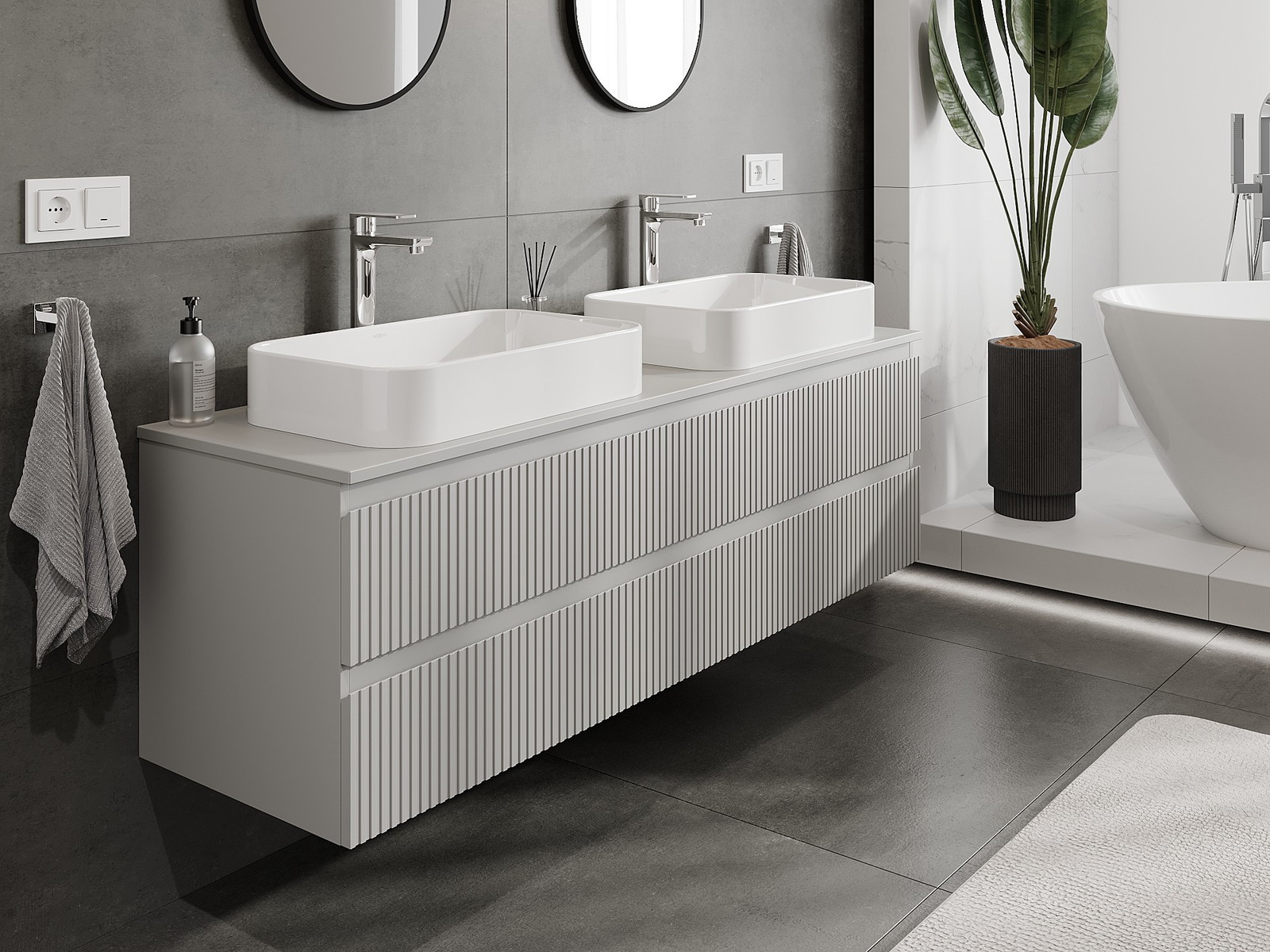 Нашите модулни мебели за баня могат да се комбинират в различни цветови конфигурации, което позволява пълна персонализация. Може да се избере както външният вид, така и функциите на отделните елементи, което позволява съчетаване на мебелите със собствените стилови и функционални предпочитания.