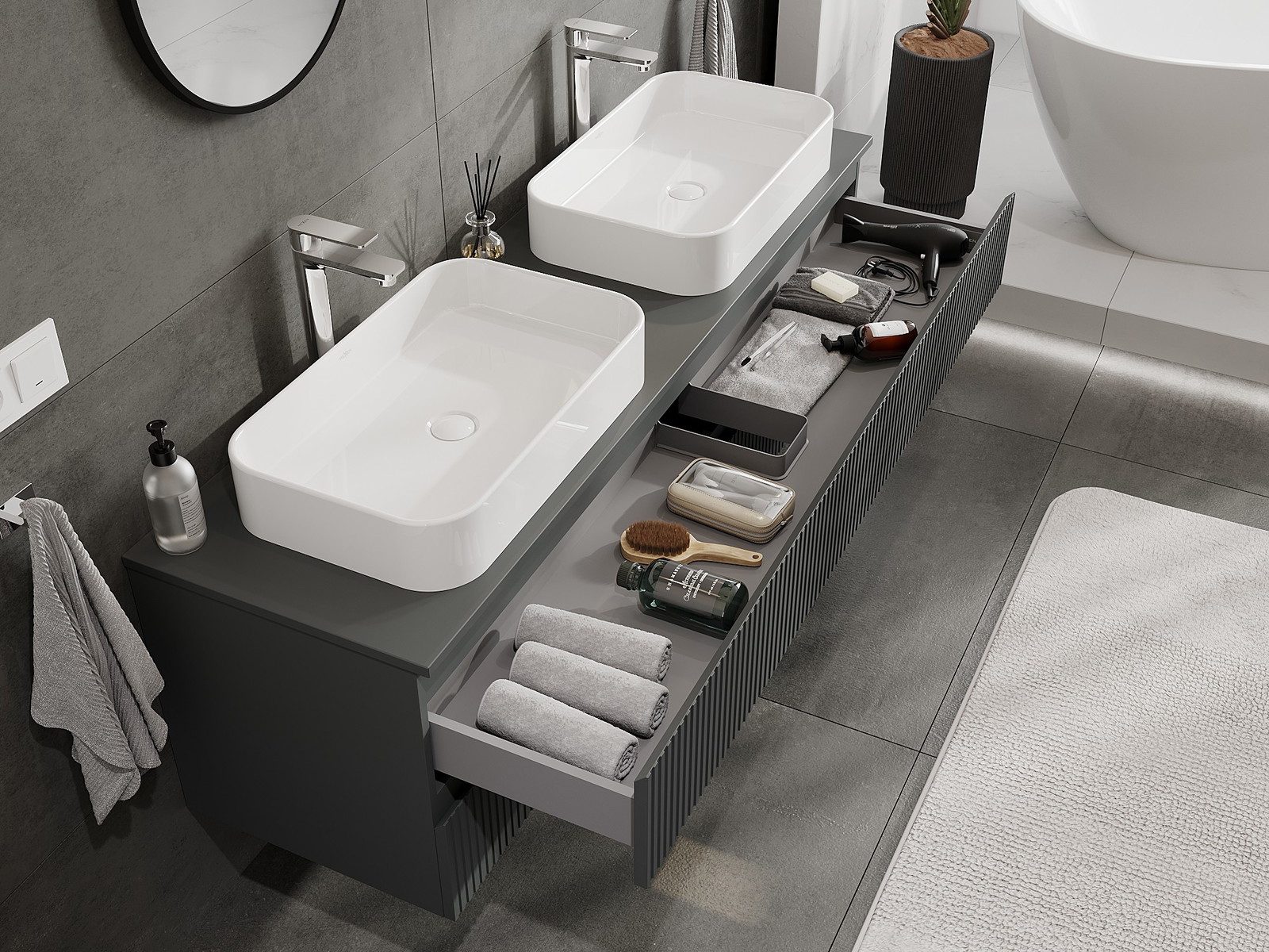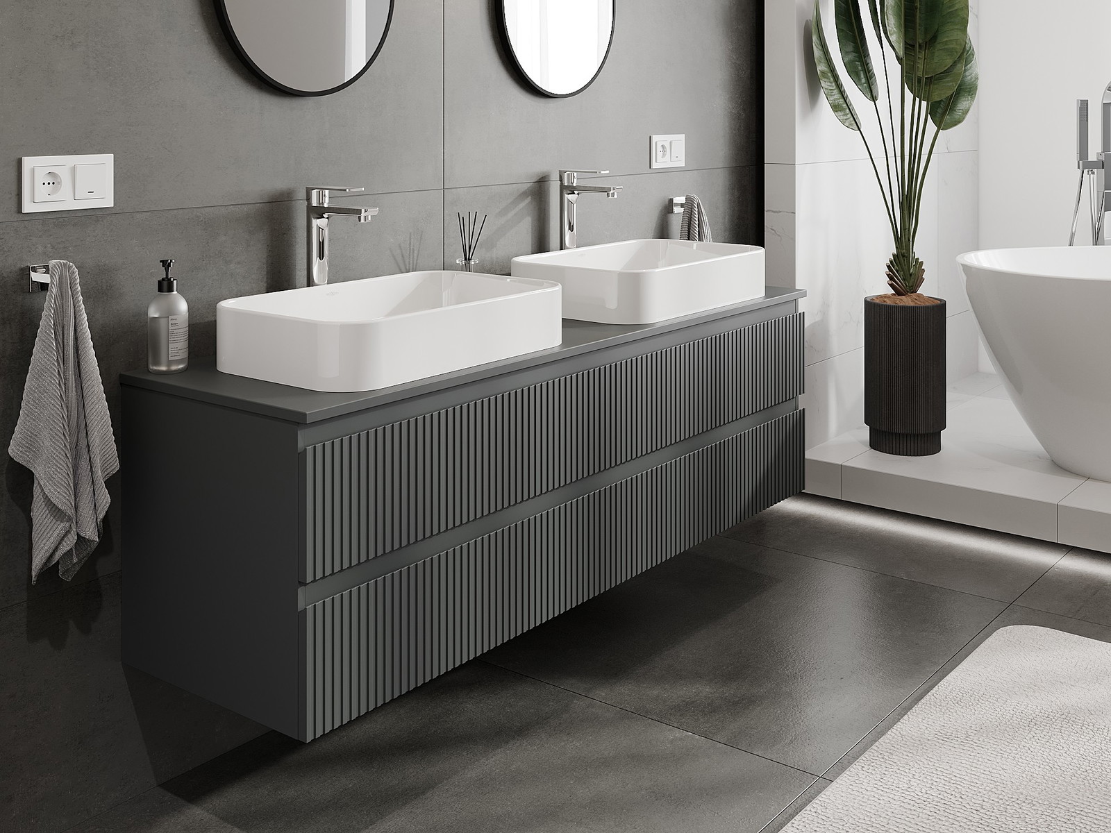 Нашите модулни мебели за баня могат да се комбинират в различни цветови конфигурации, което позволява пълна персонализация. Може да се избере както външният вид, така и функциите на отделните елементи, което позволява съчетаване на мебелите със собствените стилови и функционални предпочитания.