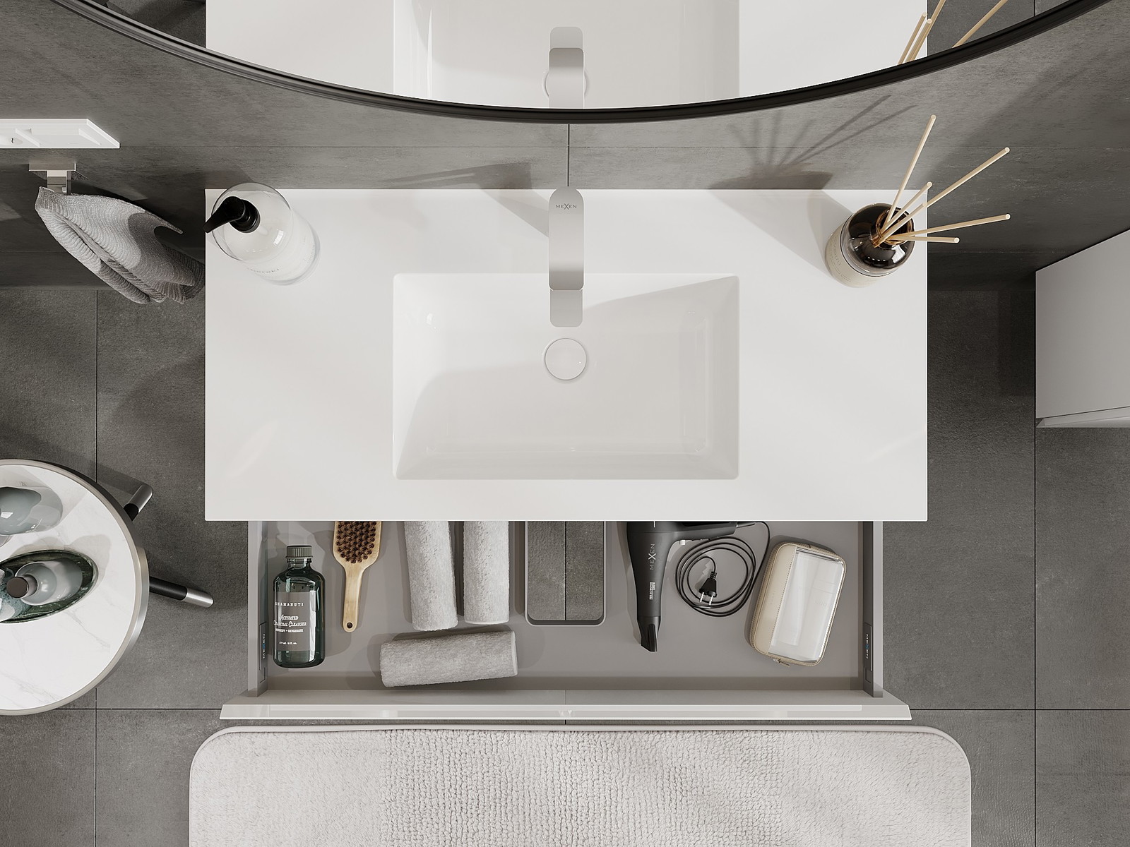 Изрезът в чекмеджето е проектиран по такъв начин, че да побере сифона, който е необходим в мивковите инсталации. Благодарение на това мебелът може да бъде монтиран напълно функционално, без да се налага отказване от пространството в чекмеджето заради инсталацията.