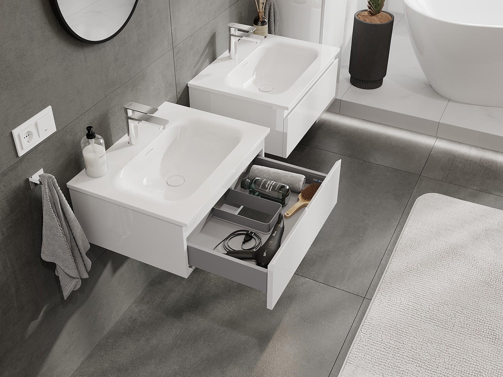 Нашите модулни мебели за баня могат да се комбинират в различни цветови конфигурации, което позволява пълна персонализация. Може да се избере както външният вид, така и функциите на отделните елементи, което позволява съчетаване на мебелите със собствените стилови и функционални предпочитания.