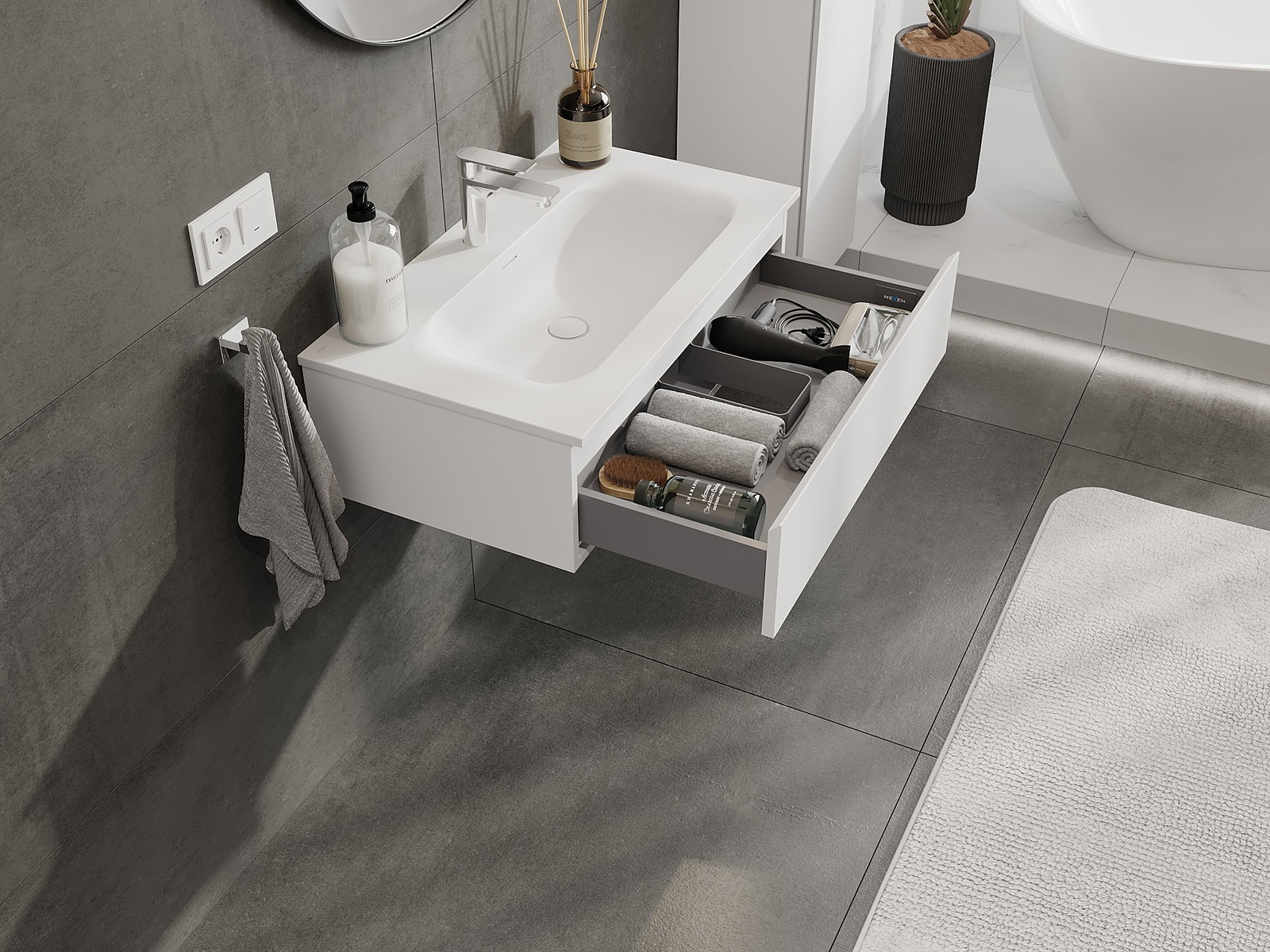Изрезът в чекмеджето е проектиран по такъв начин, че да побере сифона, който е необходим в мивковите инсталации. Благодарение на това мебелът може да бъде монтиран напълно функционално, без да се налага отказване от пространството в чекмеджето заради инсталацията.