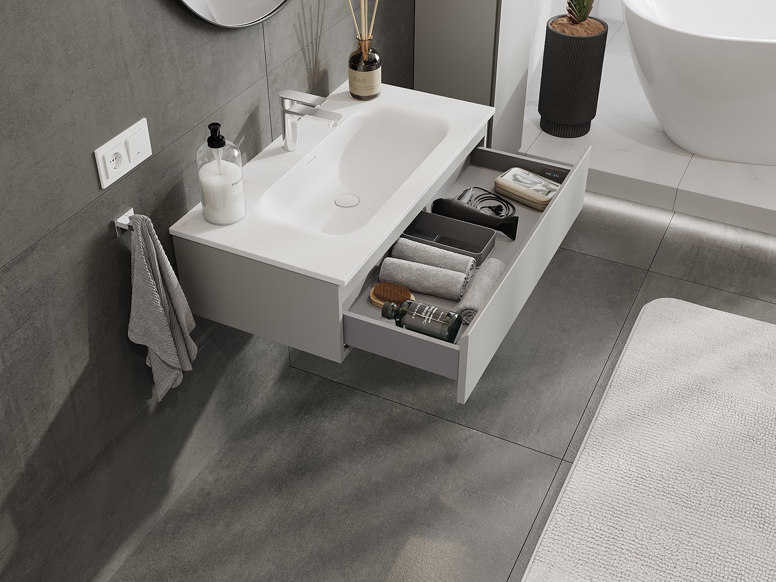 Mexen Orio шкаф за баня 90 см с мивка Vela, 1 чекмедже, сив мат/бял мат