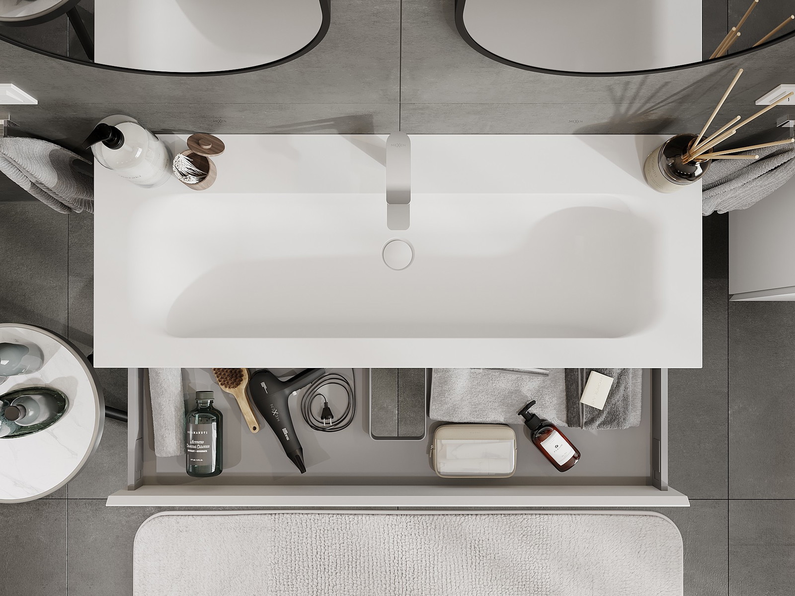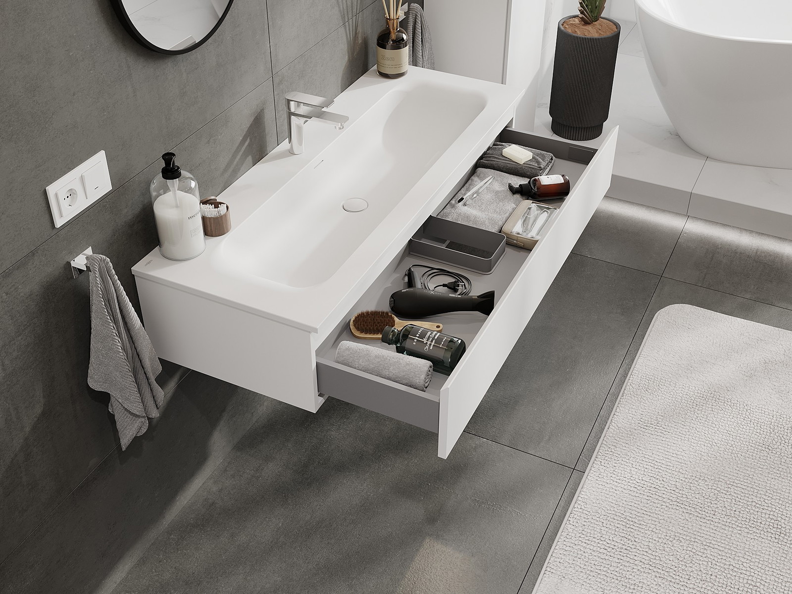 Изрезът в чекмеджето е проектиран по такъв начин, че да побере сифона, който е необходим в мивковите инсталации. Благодарение на това мебелът може да бъде монтиран напълно функционално, без да се налага отказване от пространството в чекмеджето заради инсталацията.